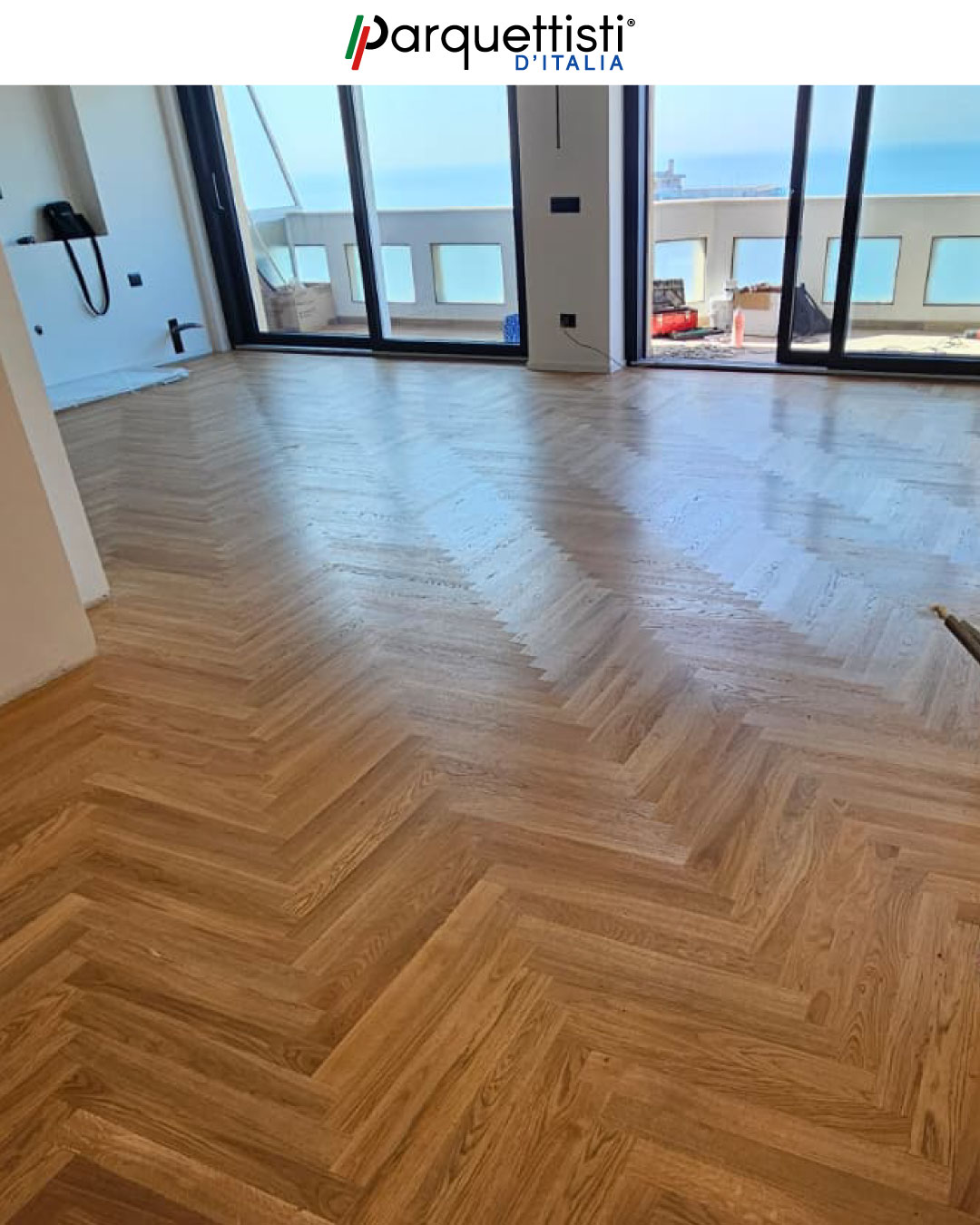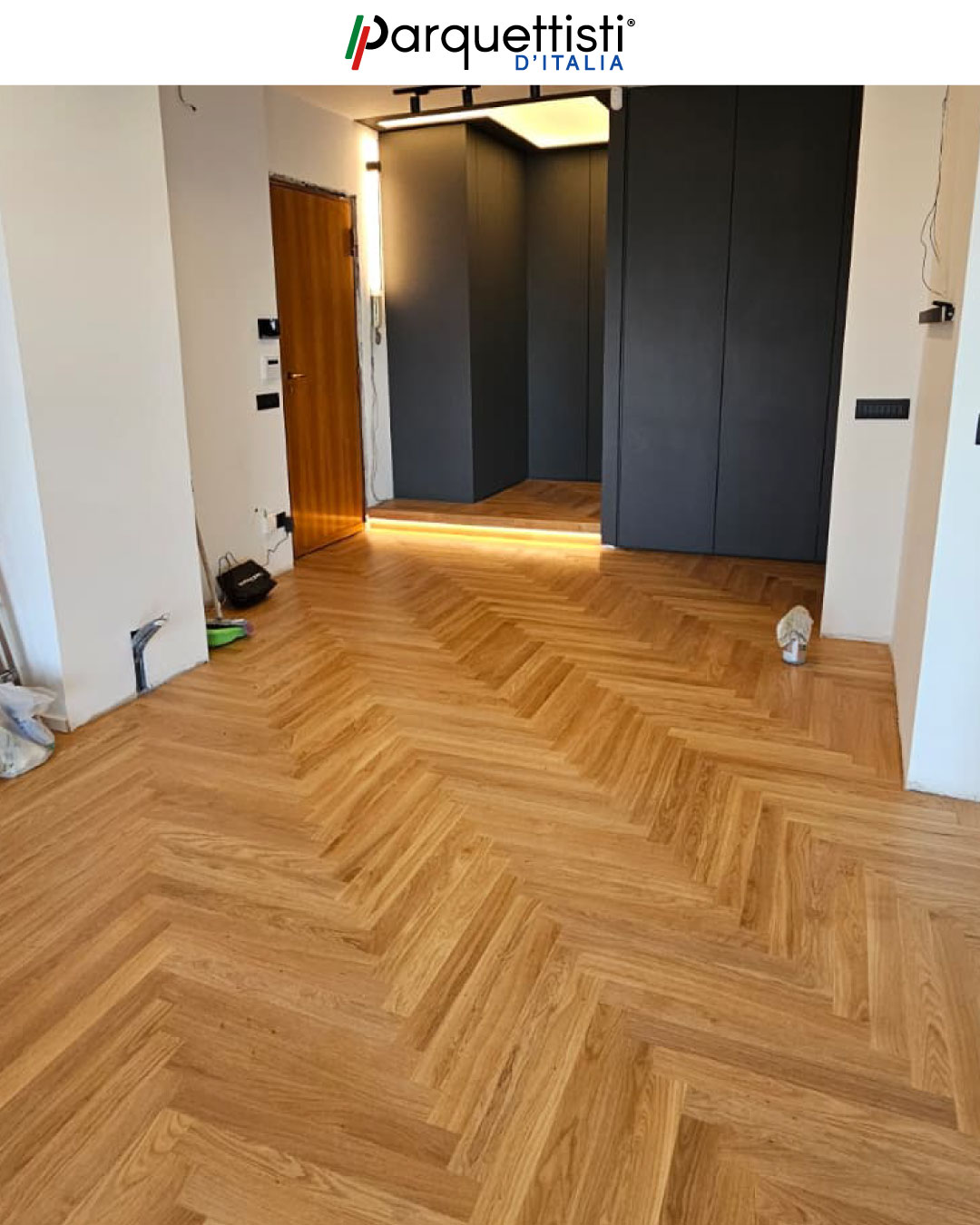 - Posa a Spina Italiana: Realizzazione di pavimentazioni in rovere prefinito con tinta calda naturale, caratterizzate da incastri millimetrici per un’eleganza classica e senza tempo.