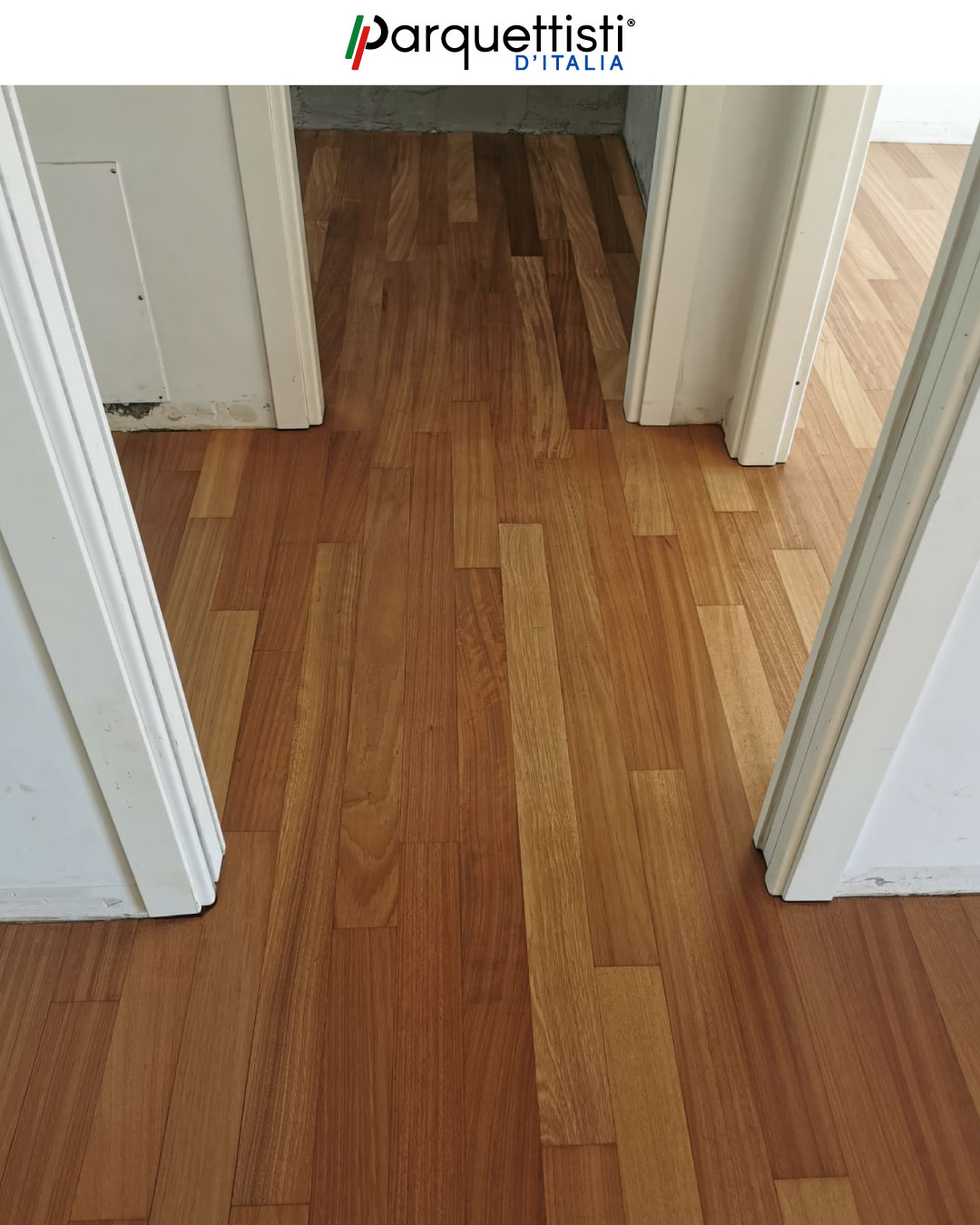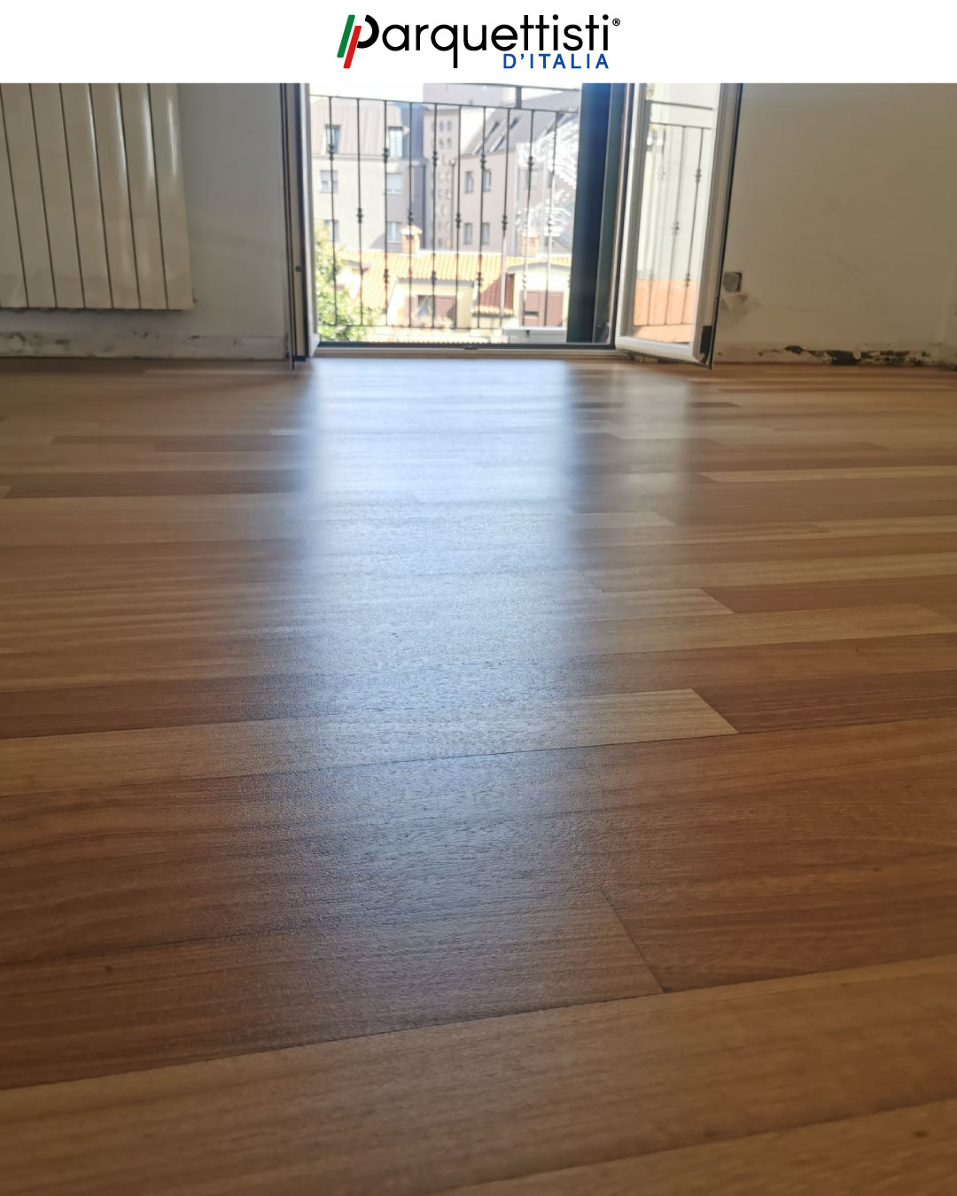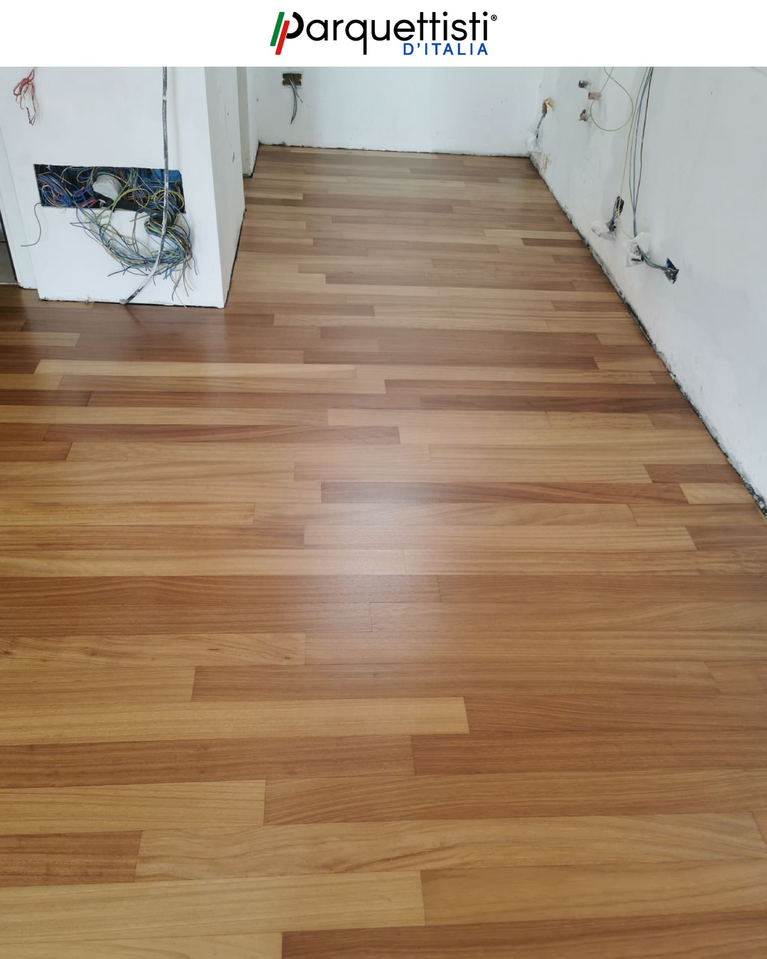 In queste fotografie il nostro Palchettista Donato presenta un raffinato pavimento in legno di Iroko, posato a correre per esaltare la naturale variabilità cromatica dell'essenza. La scelta di una finitura naturale opaca conferisce agli ambienti un aspetto sobrio e moderno, proteggendo la superficie senza nascondere la profondità delle venature. Una realizzazione che coniuga resistenza e calore, ideale per chi cerca un'atmosfera accogliente ed elegante.