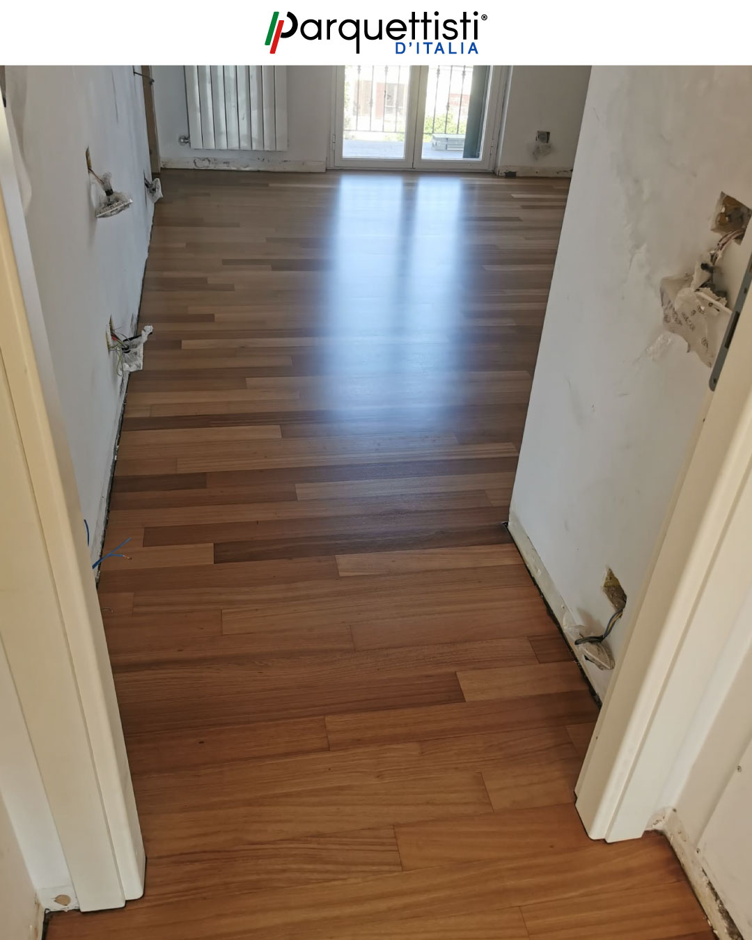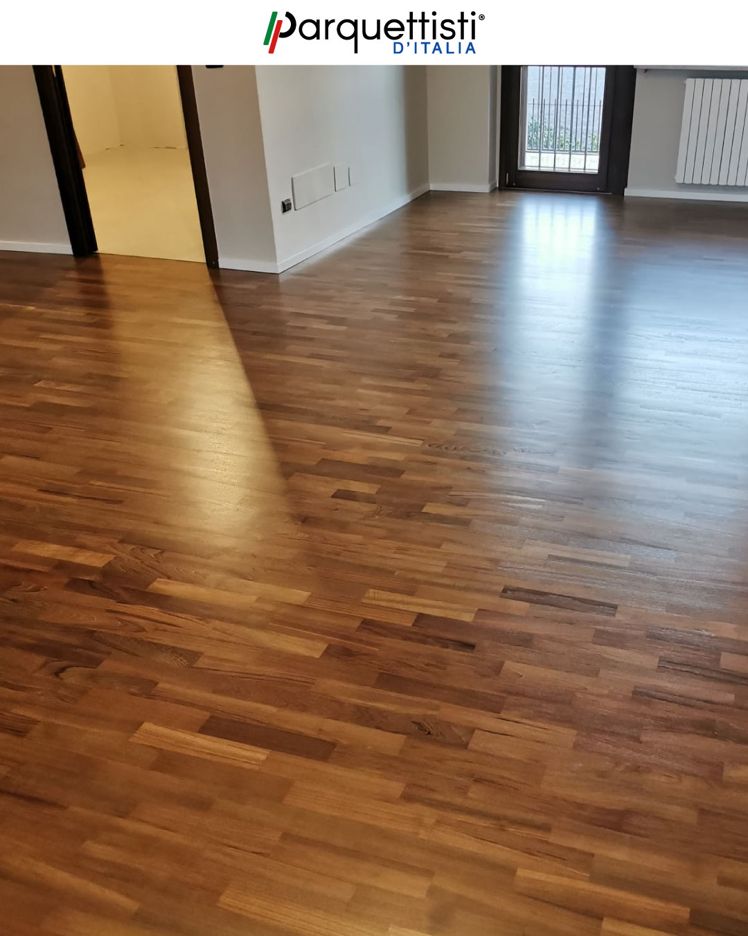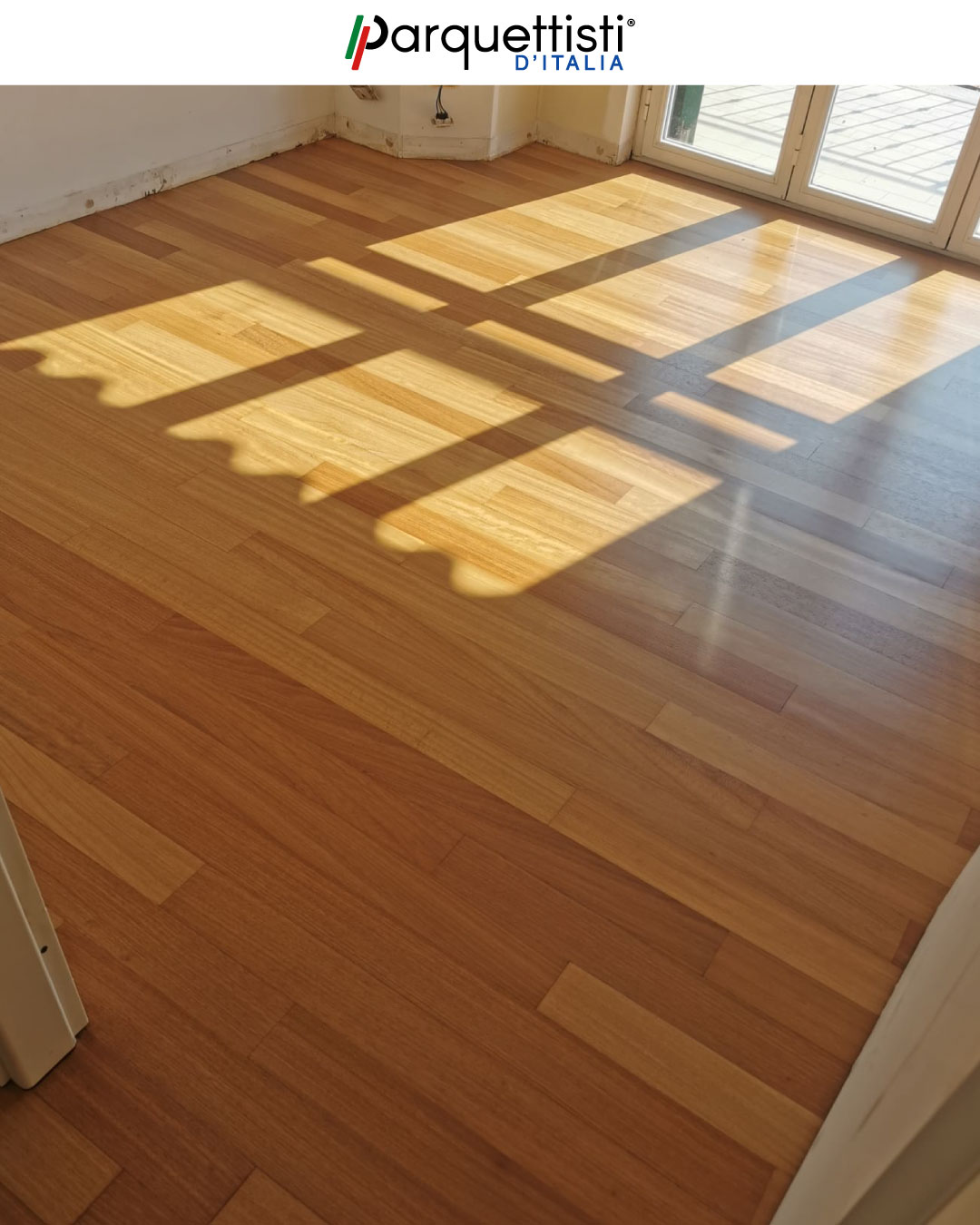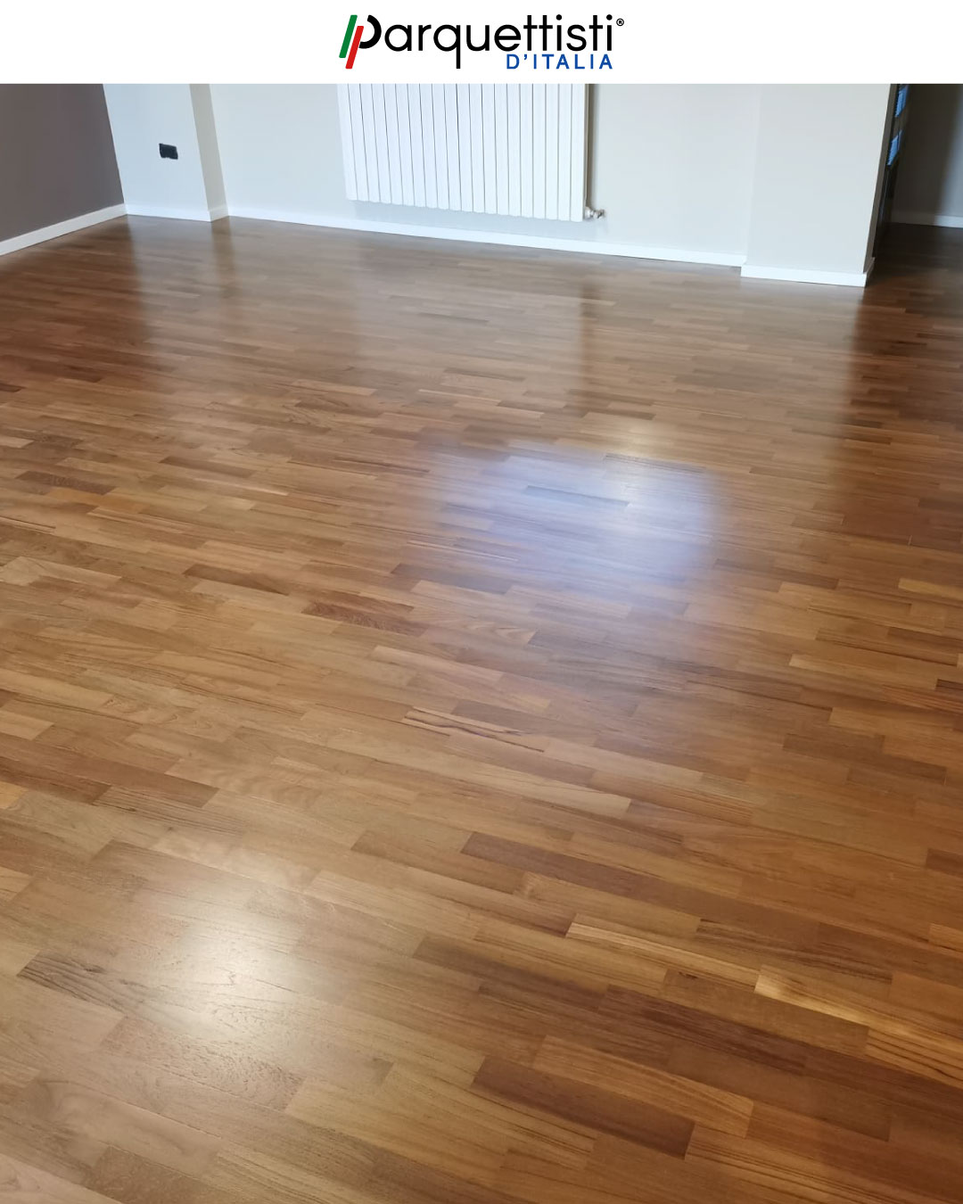 In questa realizzazione ad Alessandria Donato ha eseguito il montaggio di un pregiato palchetto in legno di Teak. Le doghe, posate con precisione millimetrica a correre, mettono in risalto l'estrema stabilità e la resistenza naturale tipiche di questa essenza esotica. La finitura valorizza le sfumature dorate del legno, creando un pavimento elegante e duraturo, perfetto per ambienti di classe.