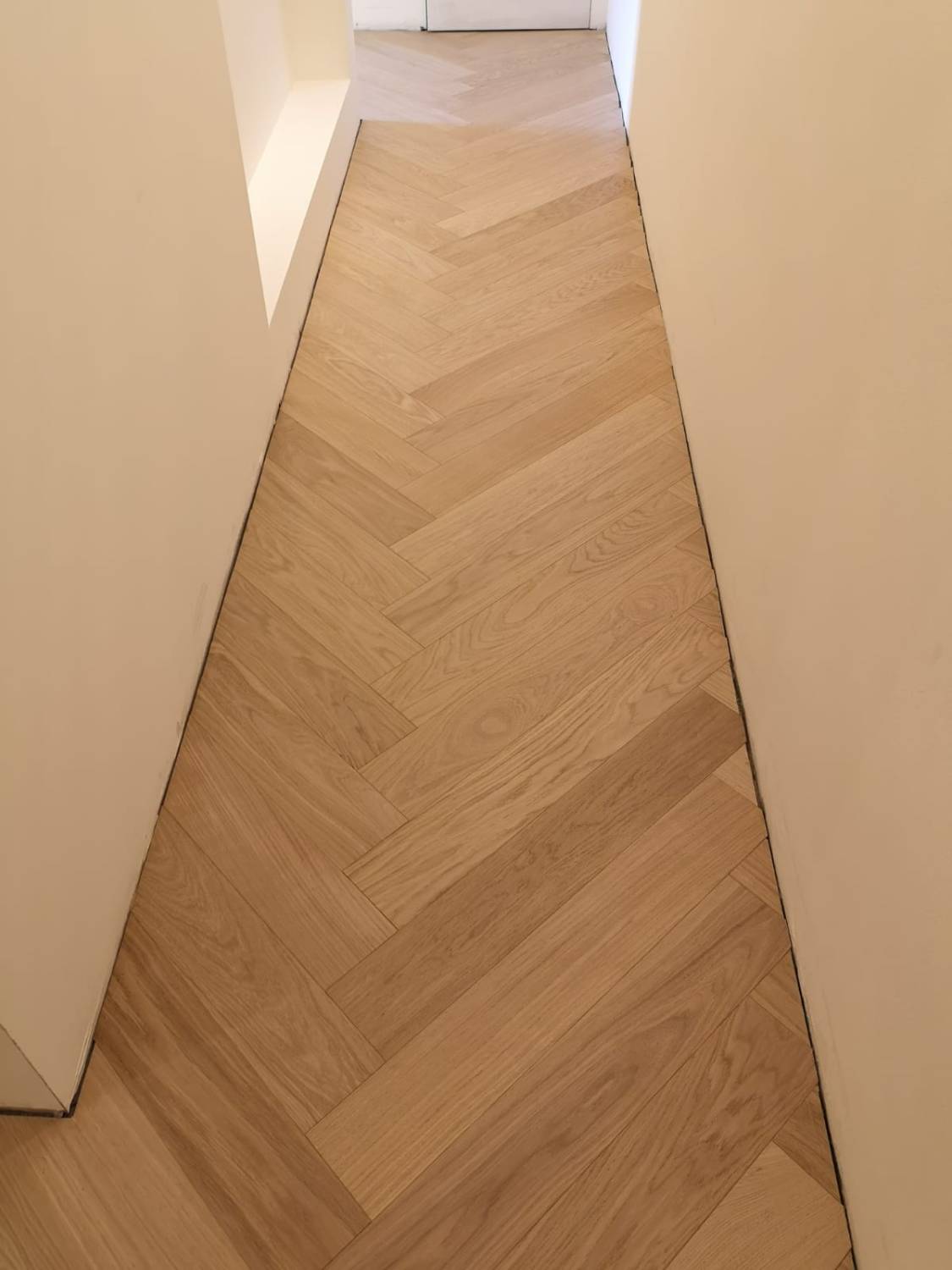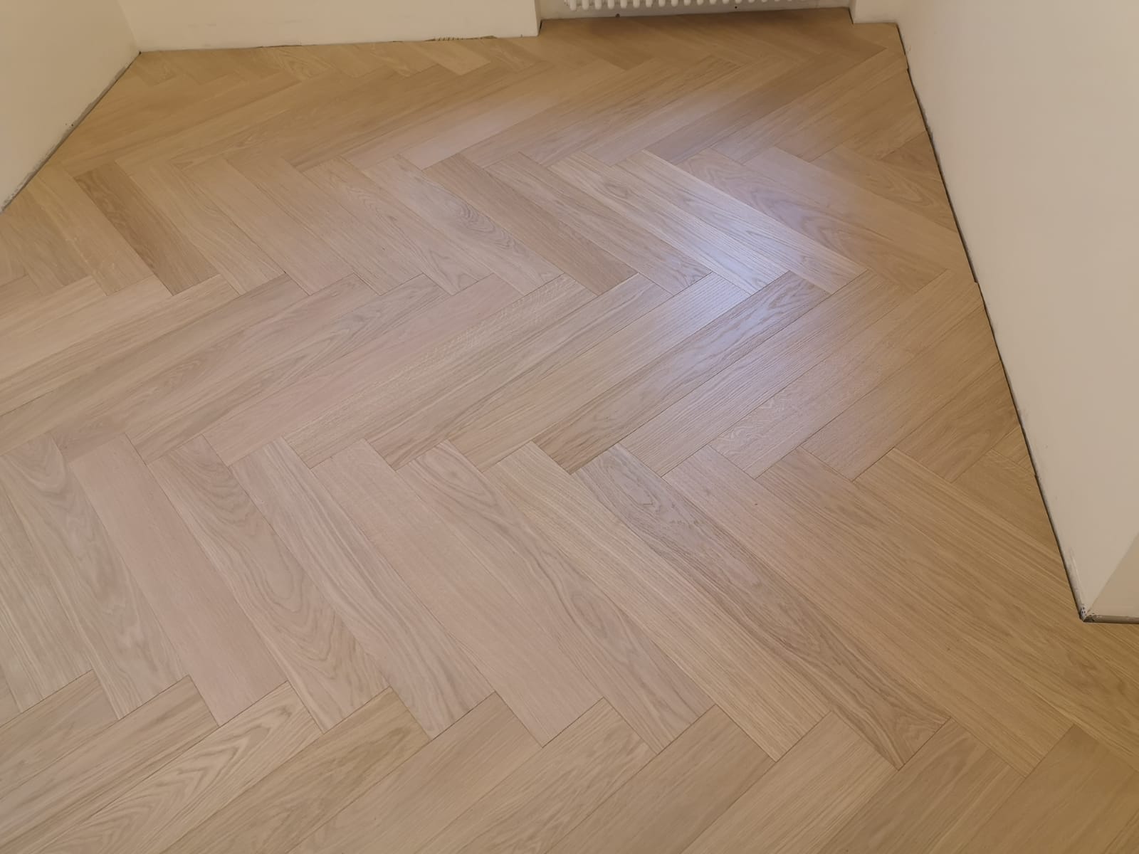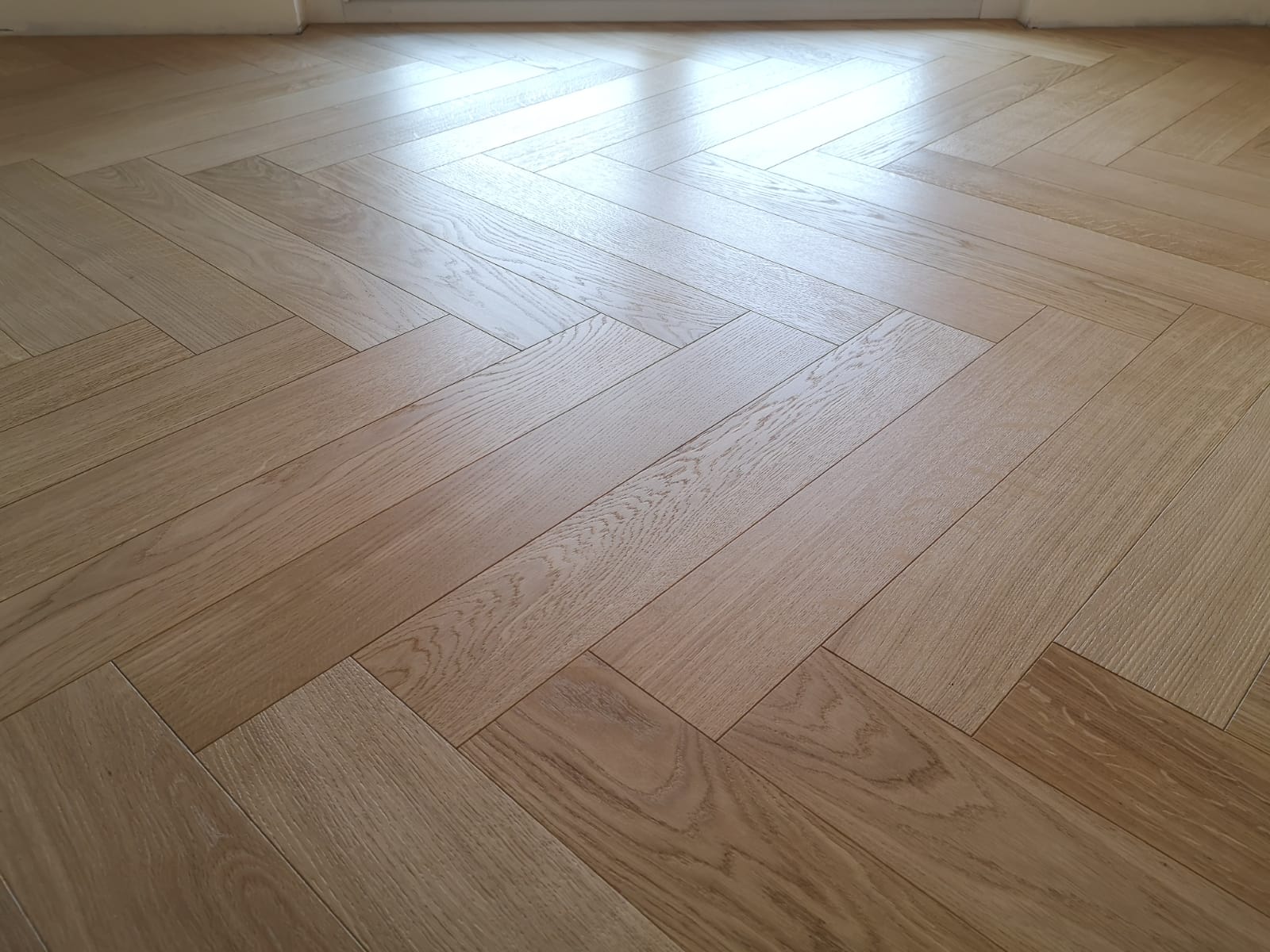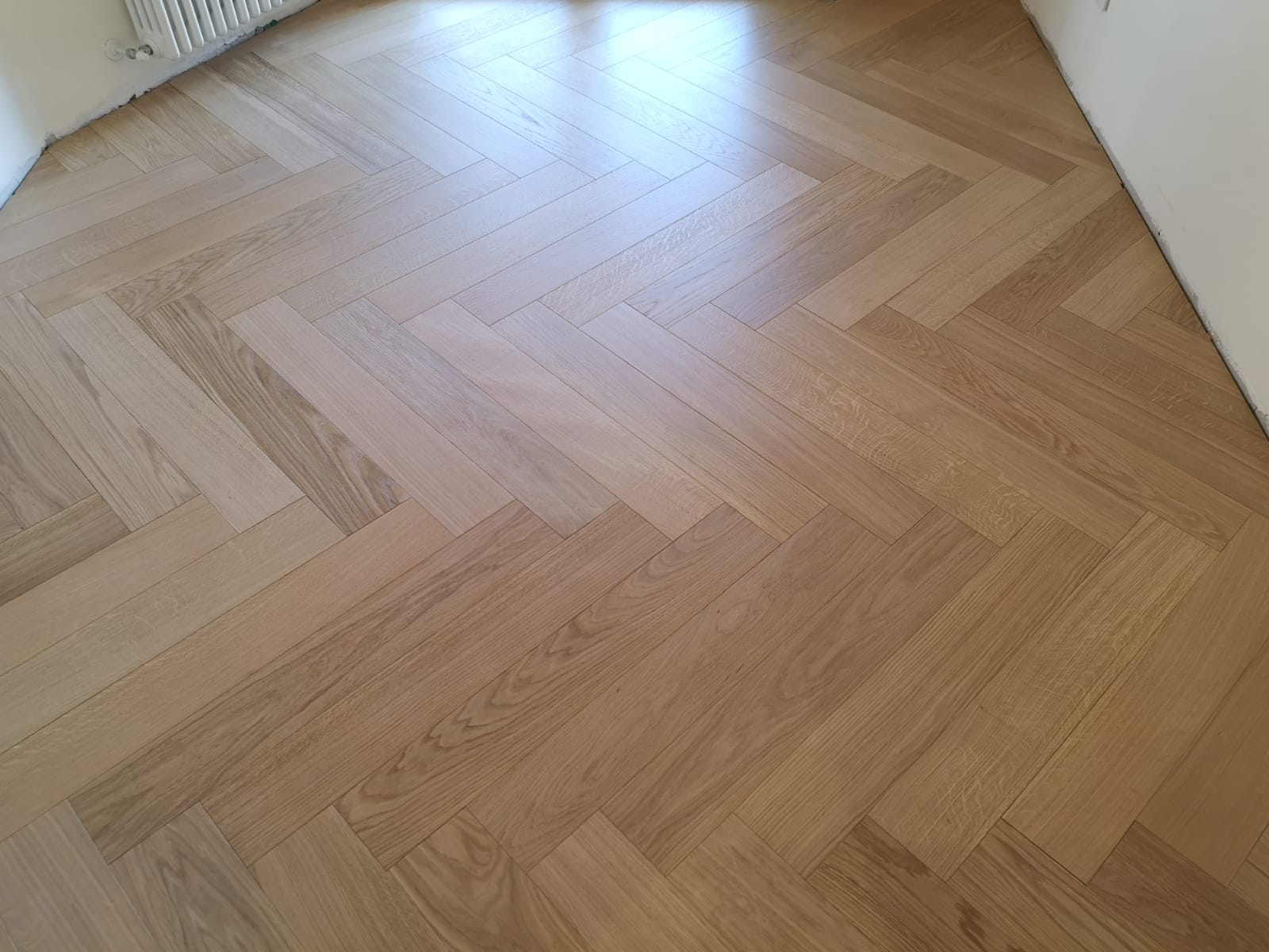 Nelle immagini di questa pagina del portale Parquettisti d'Italia mostriamo l'operato di un artigiano del parquet di nome Alessandro che opera ad Ancona e provincia e si è dedicato al montaggio di un parquet in legno prefinito ma che si poteva fare anche con legno massello grezzo di rovere in formato a spina italiana con listoncini rettangolari montati a pavimento a 90° con file contrapposte a formare un disegno geometrico regolare e molto elegante. Le operazioni di prefinitura avrebbero poi visto l'uso di macchinari per la pulitura e levigatura della superficie prima di procedere con la finitura di tre mani di vernice ad effetto semi opaco dal colore naturale.