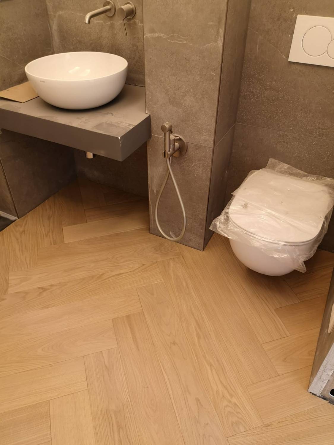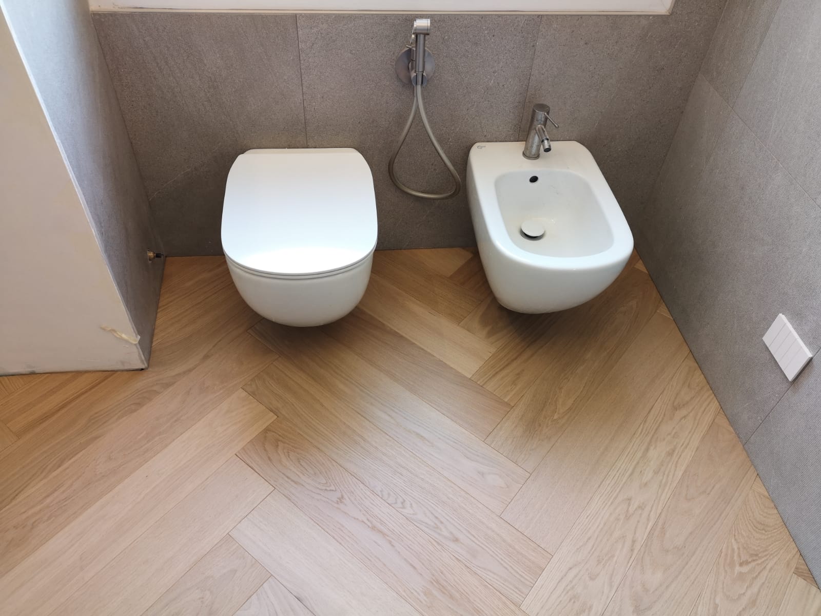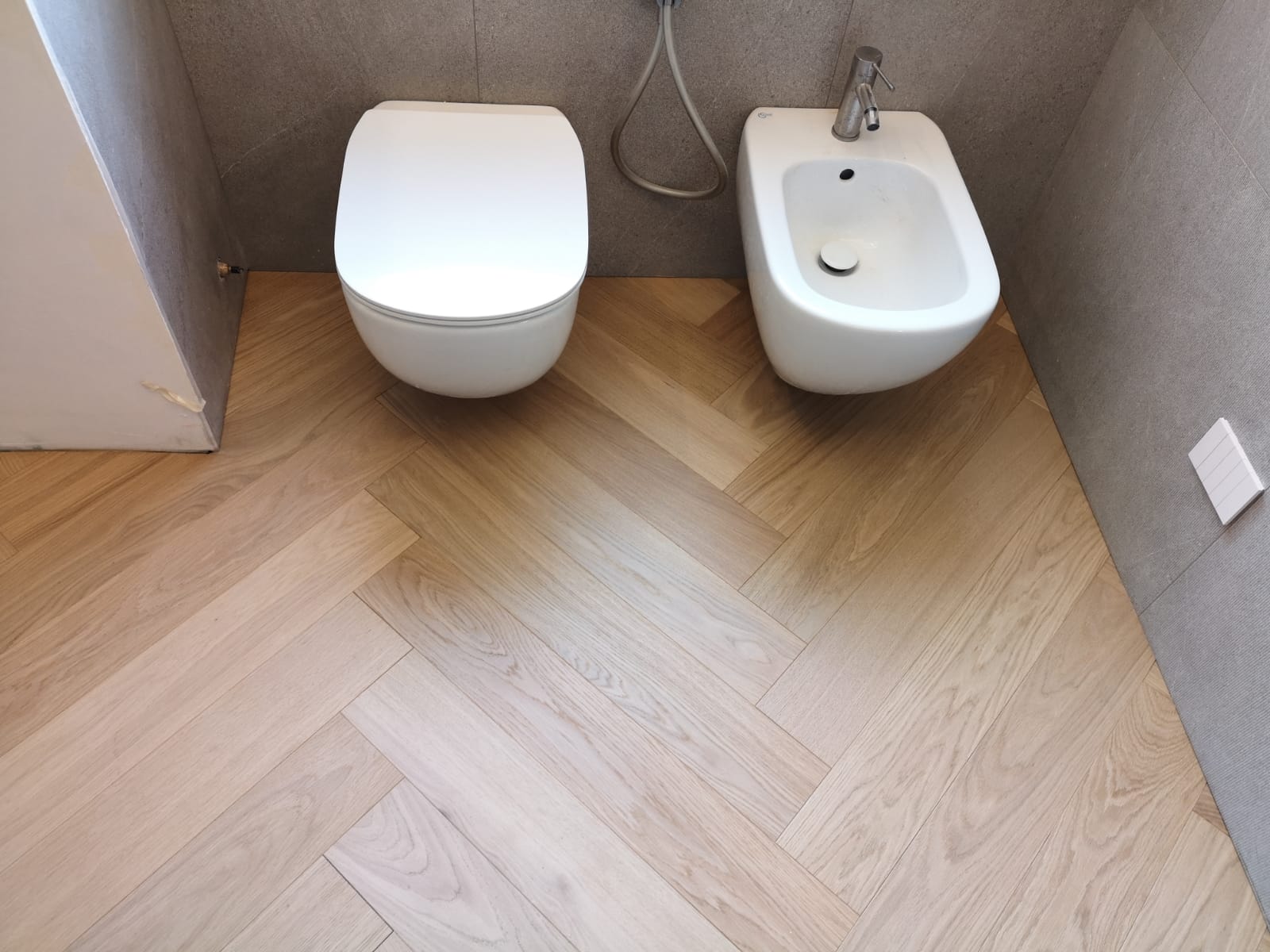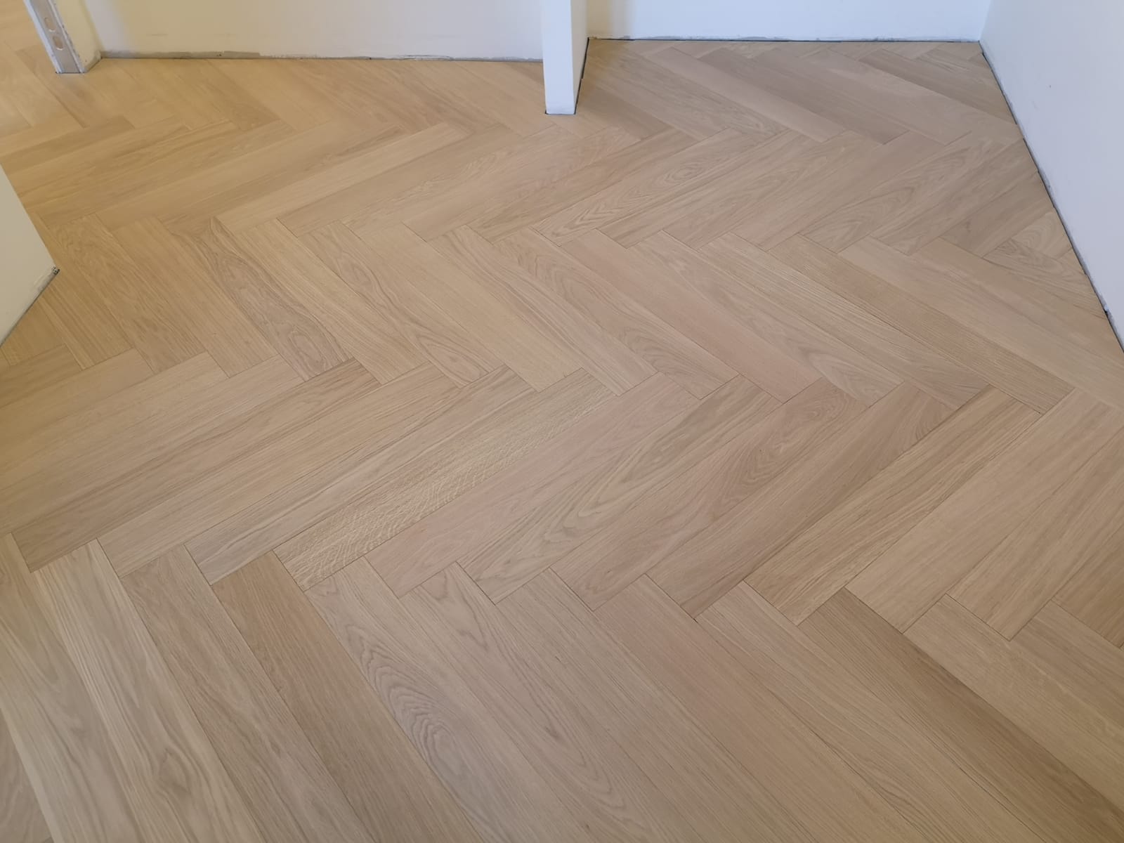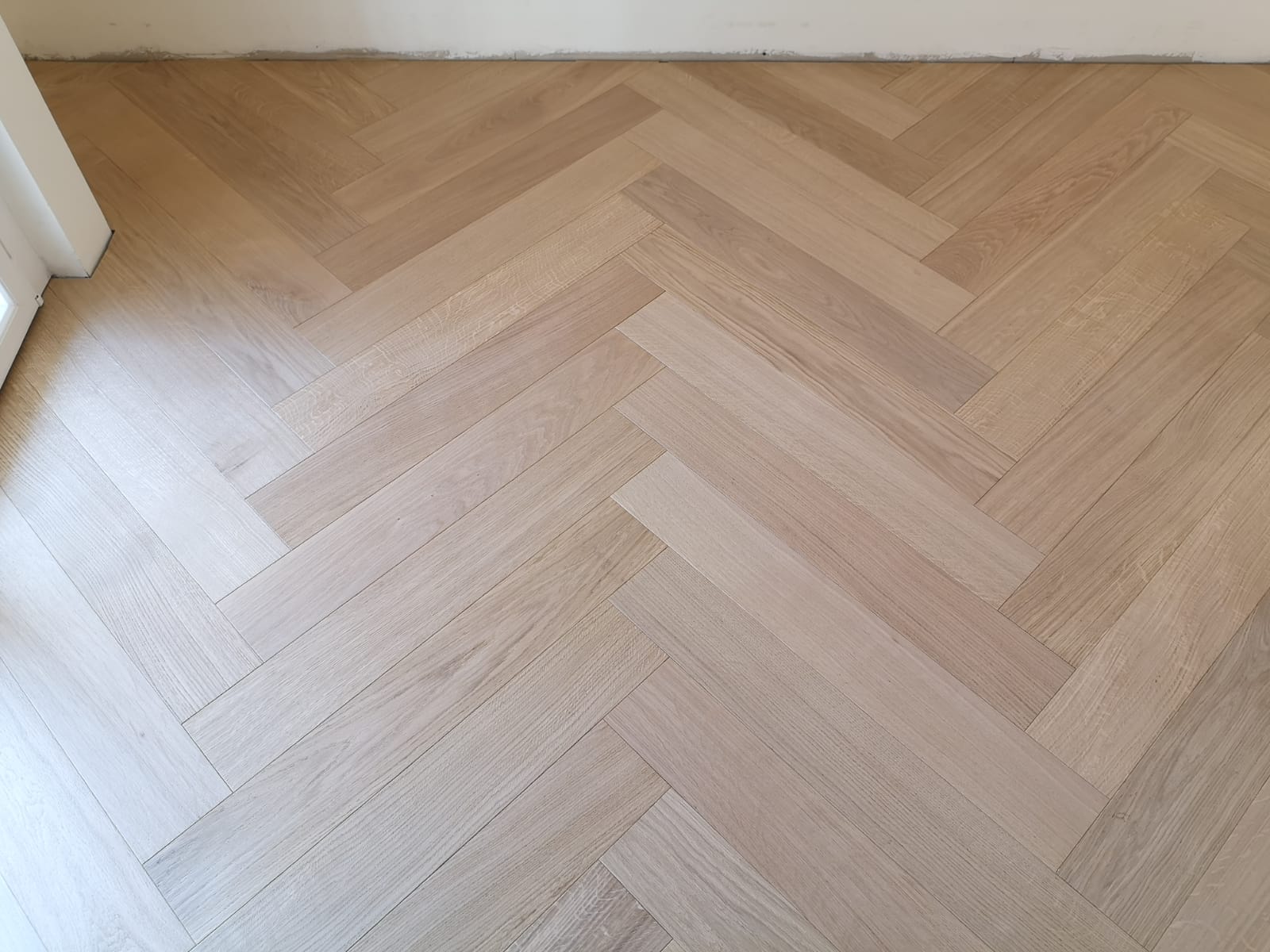 Nelle immagini di questa pagina del portale Parquettisti d'Italia mostriamo l'operato di un artigiano del parquet di nome Alessandro che opera ad Ancona e provincia e si è dedicato al montaggio di un parquet in legno prefinito ma che si poteva fare anche con legno massello grezzo di rovere in formato a spina italiana con listoncini rettangolari montati a pavimento a 90° con file contrapposte a formare un disegno geometrico regolare e molto elegante. Le operazioni di prefinitura avrebbero poi visto l'uso di macchinari per la pulitura e levigatura della superficie prima di procedere con la finitura di tre mani di vernice ad effetto semi opaco dal colore naturale.