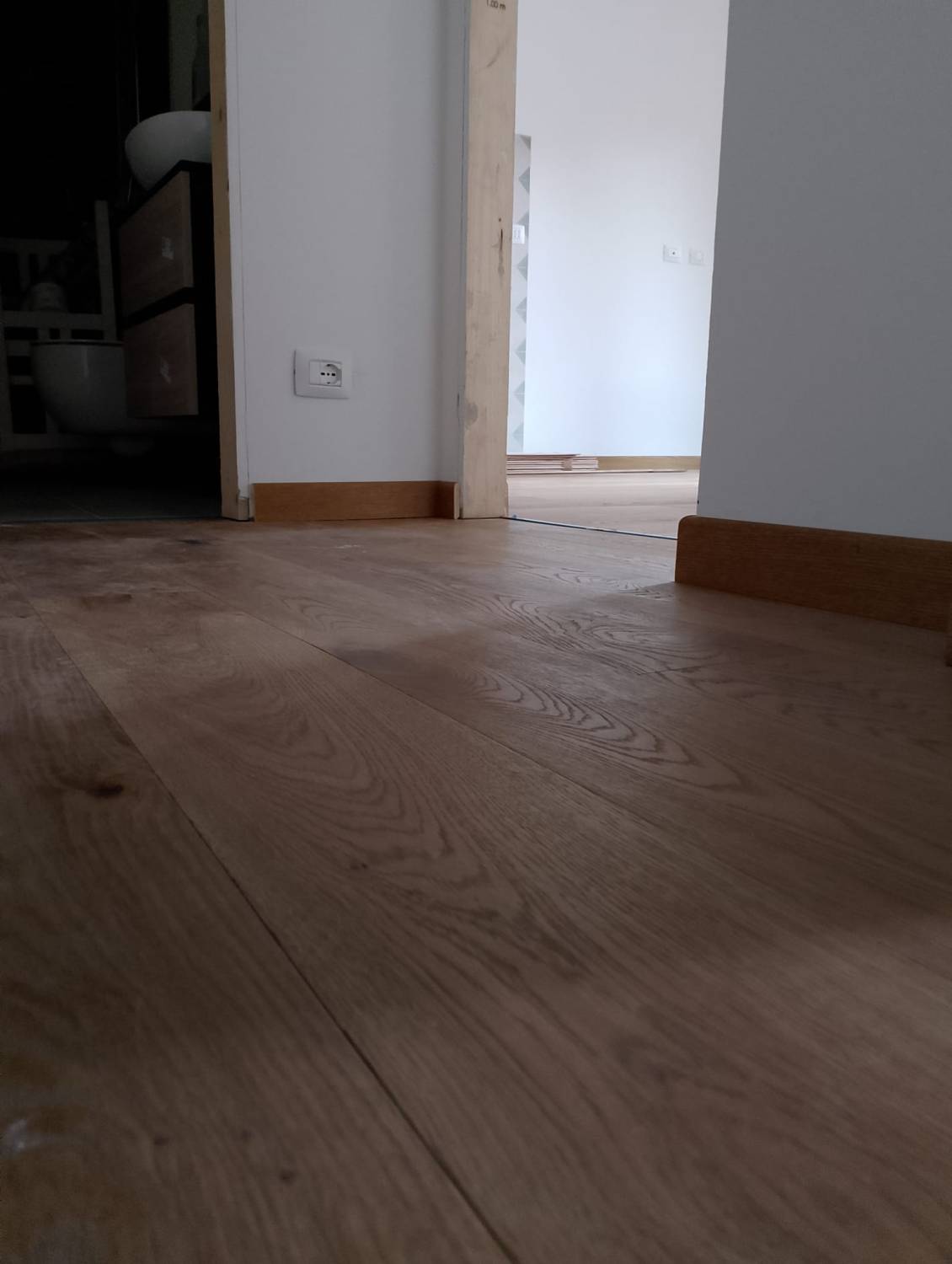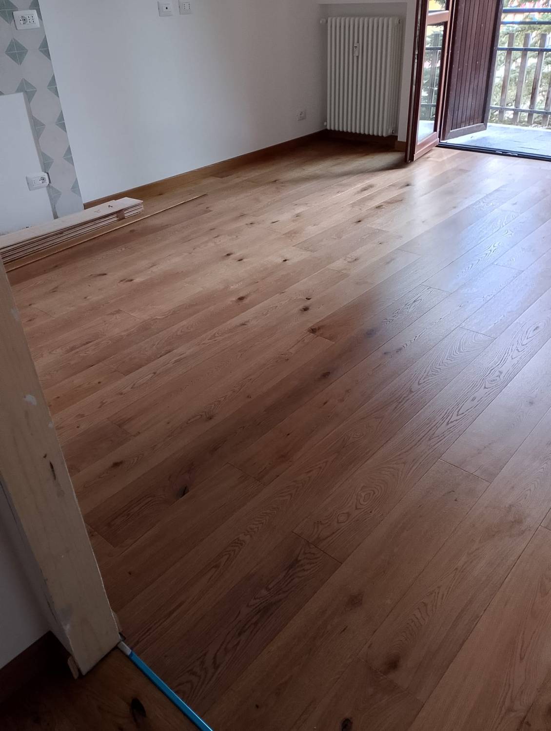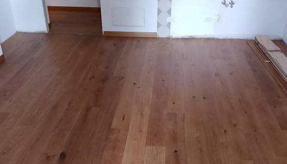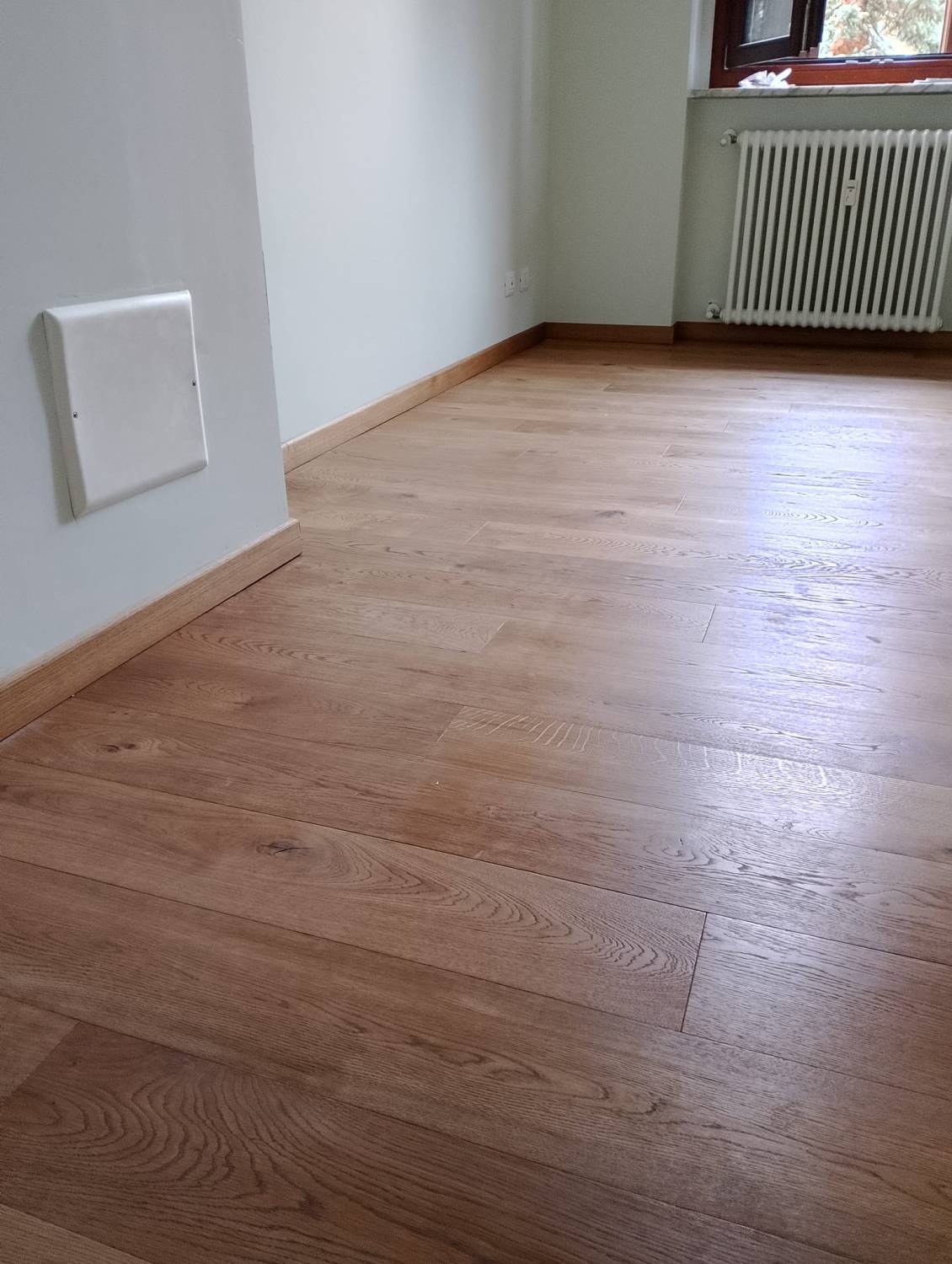 Incontrerai così specialisti del parquet come Stefano, che ci ha inviato queste immagini: rappresentano la posa di un parquet in legno di rovere da quercia tinto color noce scuro, con una spazzolatura marcata per dare una texture materica alla superficie del pavimento in legno. La selezione rustica dona calore all'ambiente e lo zoccolino, o battiscopa, posato in tinta con il pavimento completa una posa in opera di questo parquet eseguita secondo tutte le migliori regole del buon costruire. Stefano e i suoi colleghi ti aspettano: registrati come utente in pochi secondi e cercali.