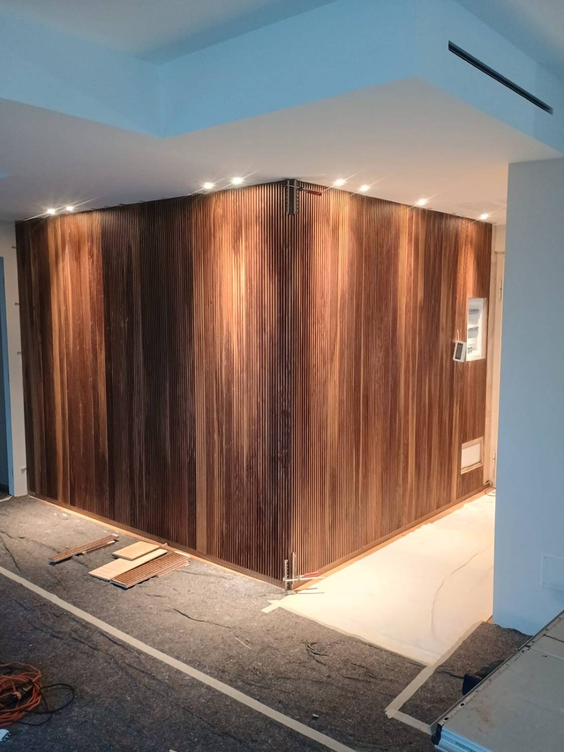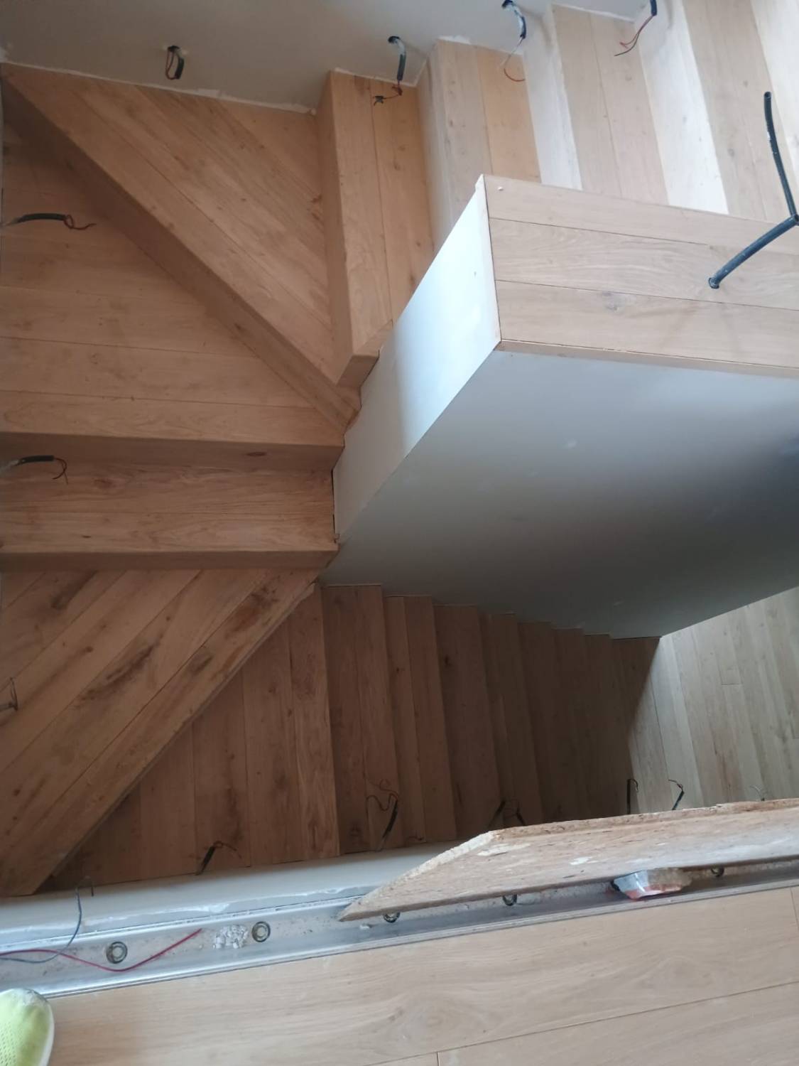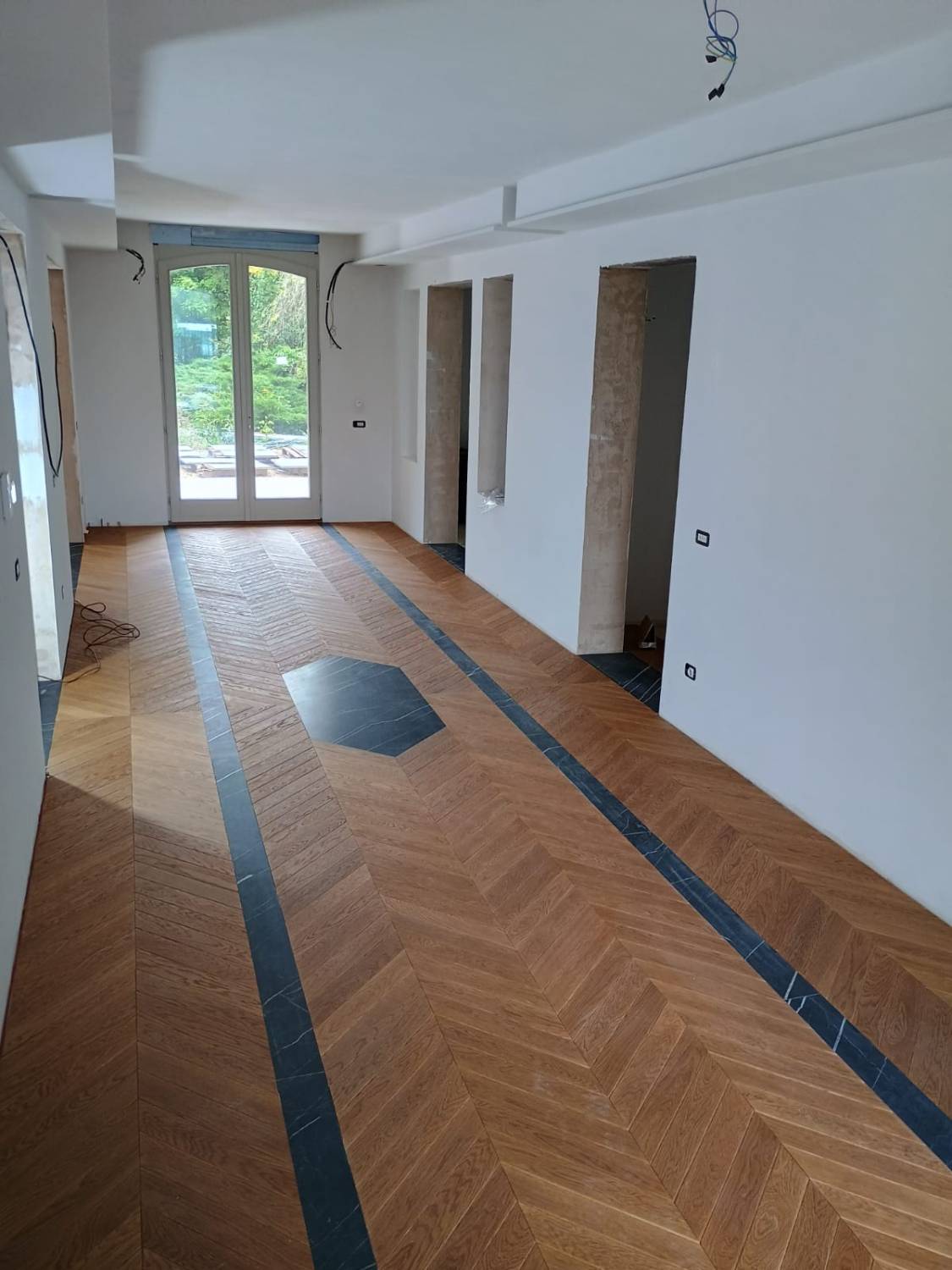 Non scenderemo nei particolari e ci limiteremo a descrivere il lavoro di certosina qualità che si comprende da queste immagini: legni africani di varia foggia e tipologia mescolati tra loro in forme complesse stese a terra in un mosaico di disegni geometrici da veri artisti. Non possiamo rivelare i segreti del mestiere ma si sappia che per eseguire un lavoro di questo tipo occorrono esperienza e grande pazienza e metodo. Ma vediamo anche altro in queste immagini, lavori eseguiti in più comuni abitazioni in provincia di Biella o nelle vicine Novara e Vercelli: un parquet di quadrotte in legno sbiancato, o una splendida parete ricoperta da una boiserie in legno a doghe verticali di una essenza rossiccia in legno massello. La scala invece è stata costruita su misura con la copertura gradino per gradino a paertire da doghe di quercia rustica nodata per rivestire l'intera struttura con rivestimento di alzata e pedata senza torello.