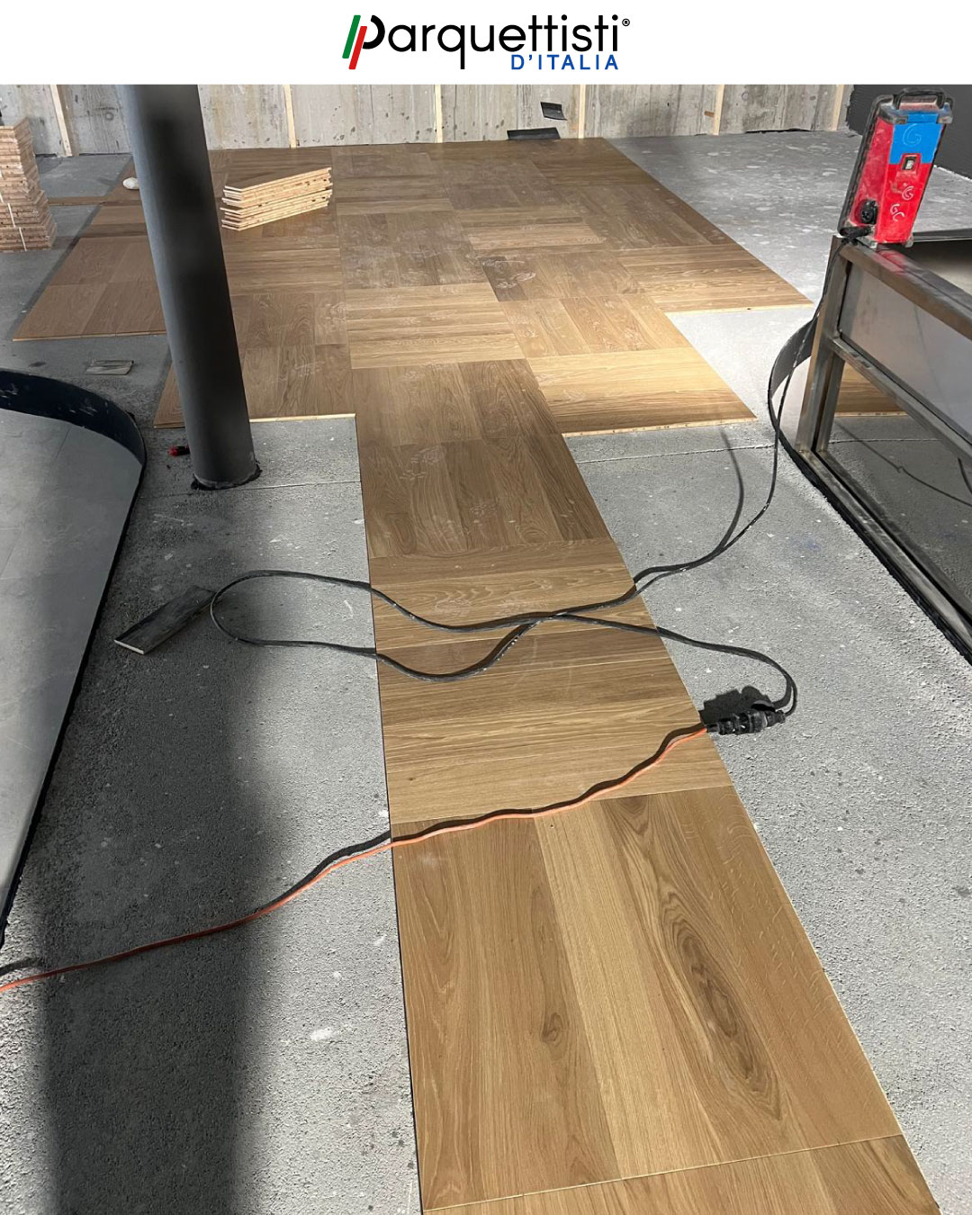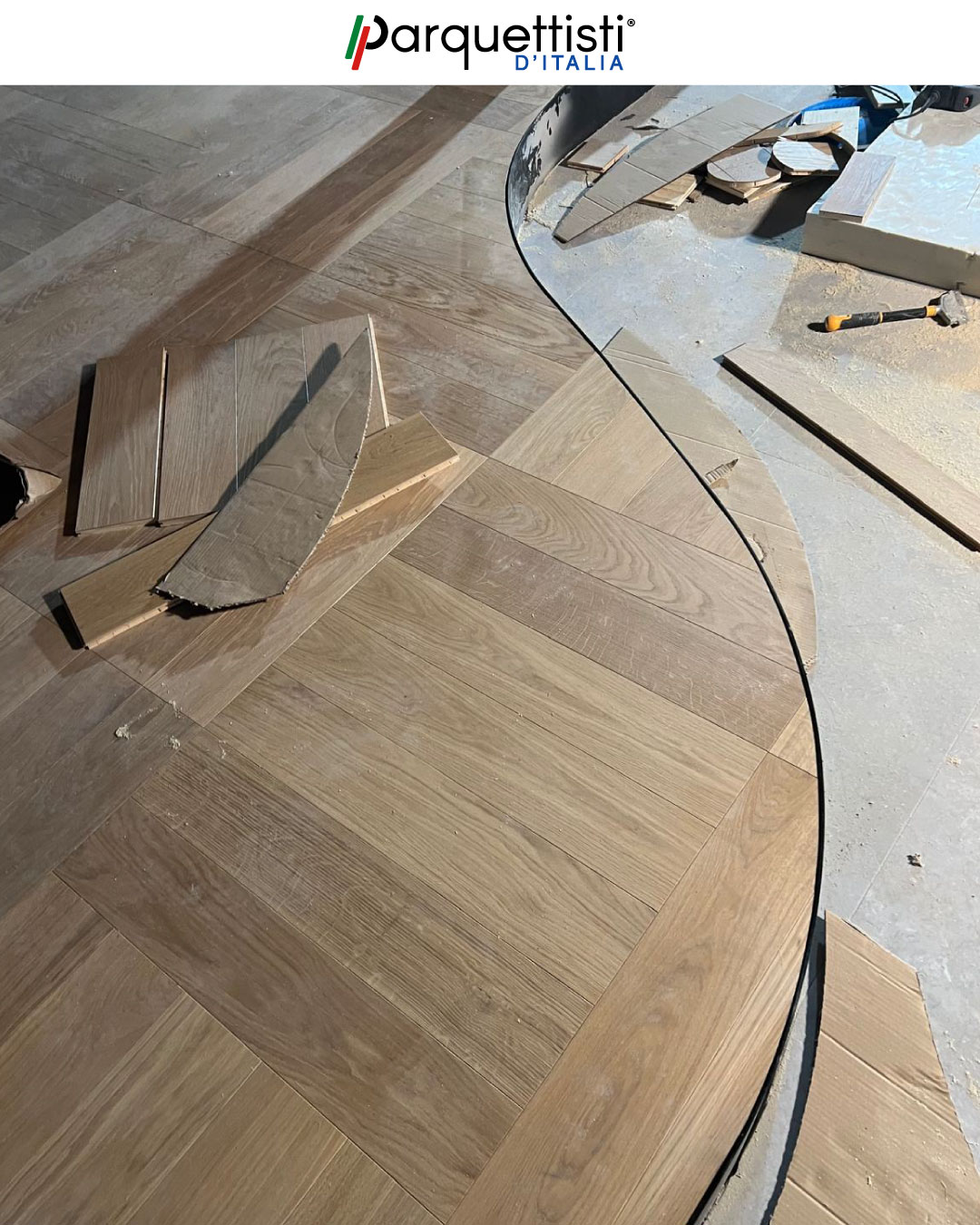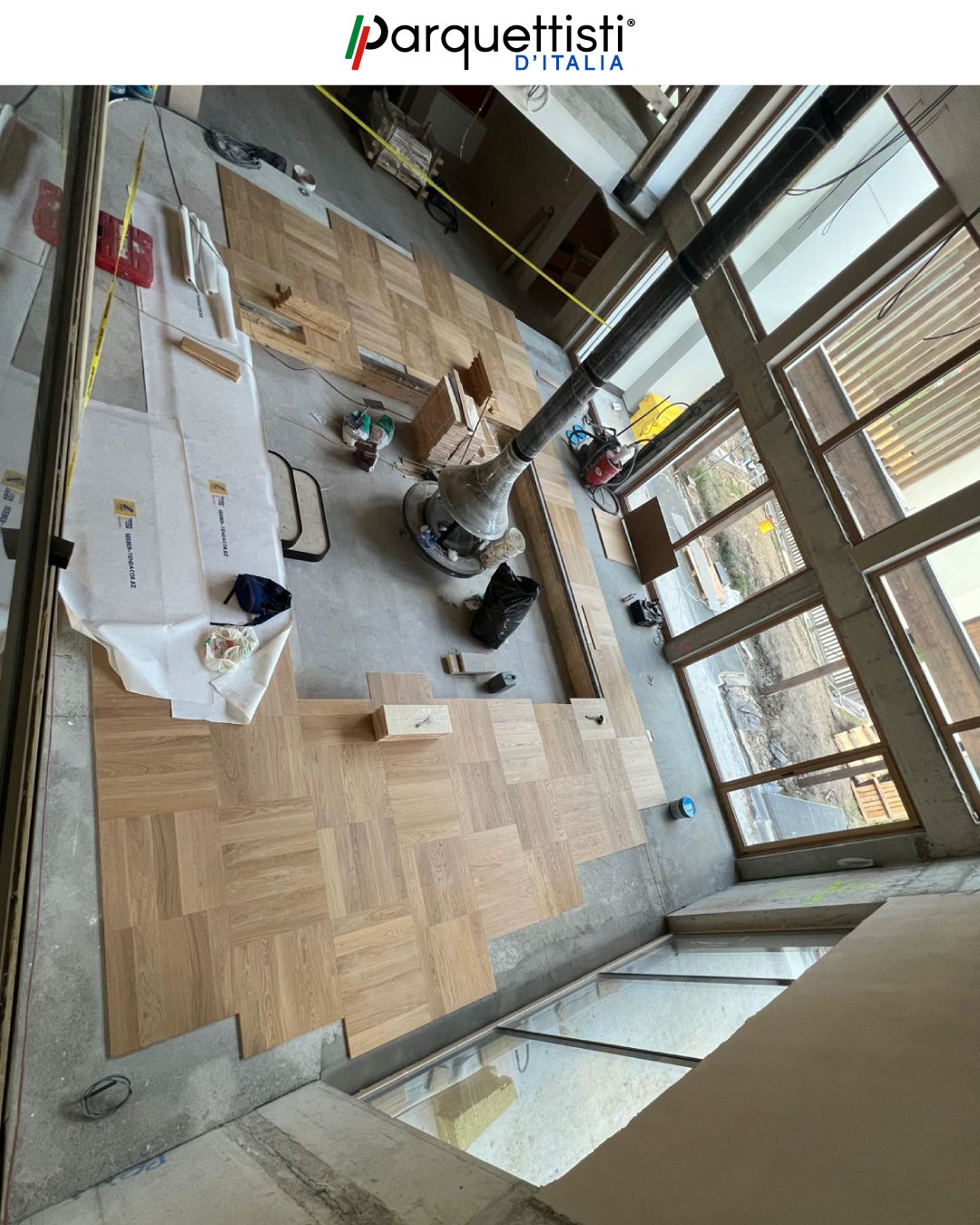 In questo prestigioso cantiere a Bolzano, Besmir esegue una posa magistrale a quadrotte in rovere di prima scelta. L'intervento si distingue per la complessità dei raccordi, realizzati con tagli curvi e profili su misura attorno agli elementi architettonici portanti e alla zona camino. Il risultato è un pavimento geometrico impeccabile che esalta la modernità dello spazio, coniugando precisione tecnica e calore naturale.