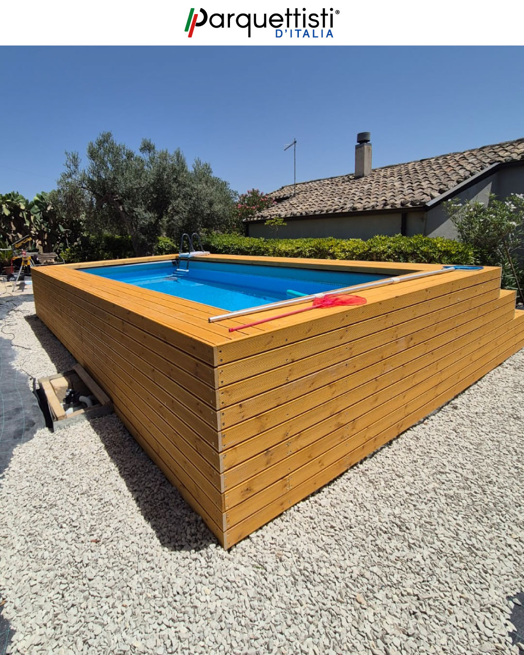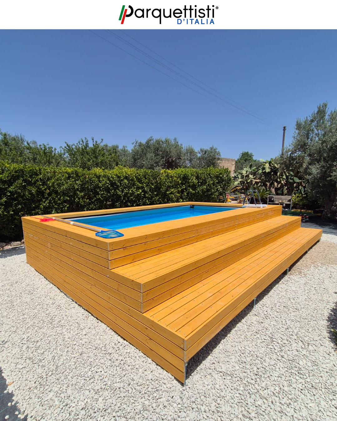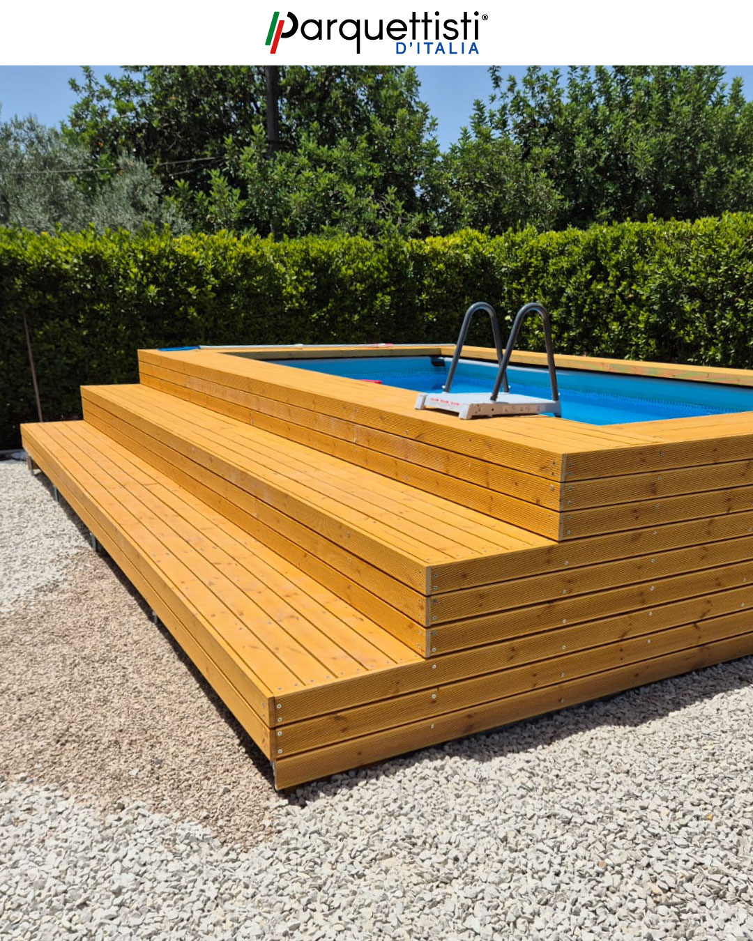 - Decking e Solarium Esterni: Progettazione e posa di pedane in legno per bordi piscina, complete di scalinate funzionali e doghe con finitura antiscivolo.