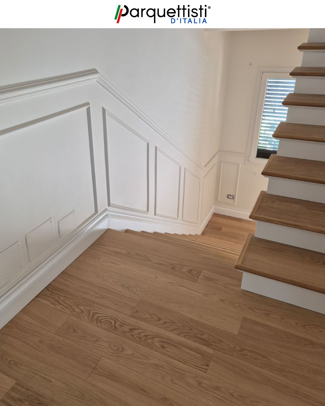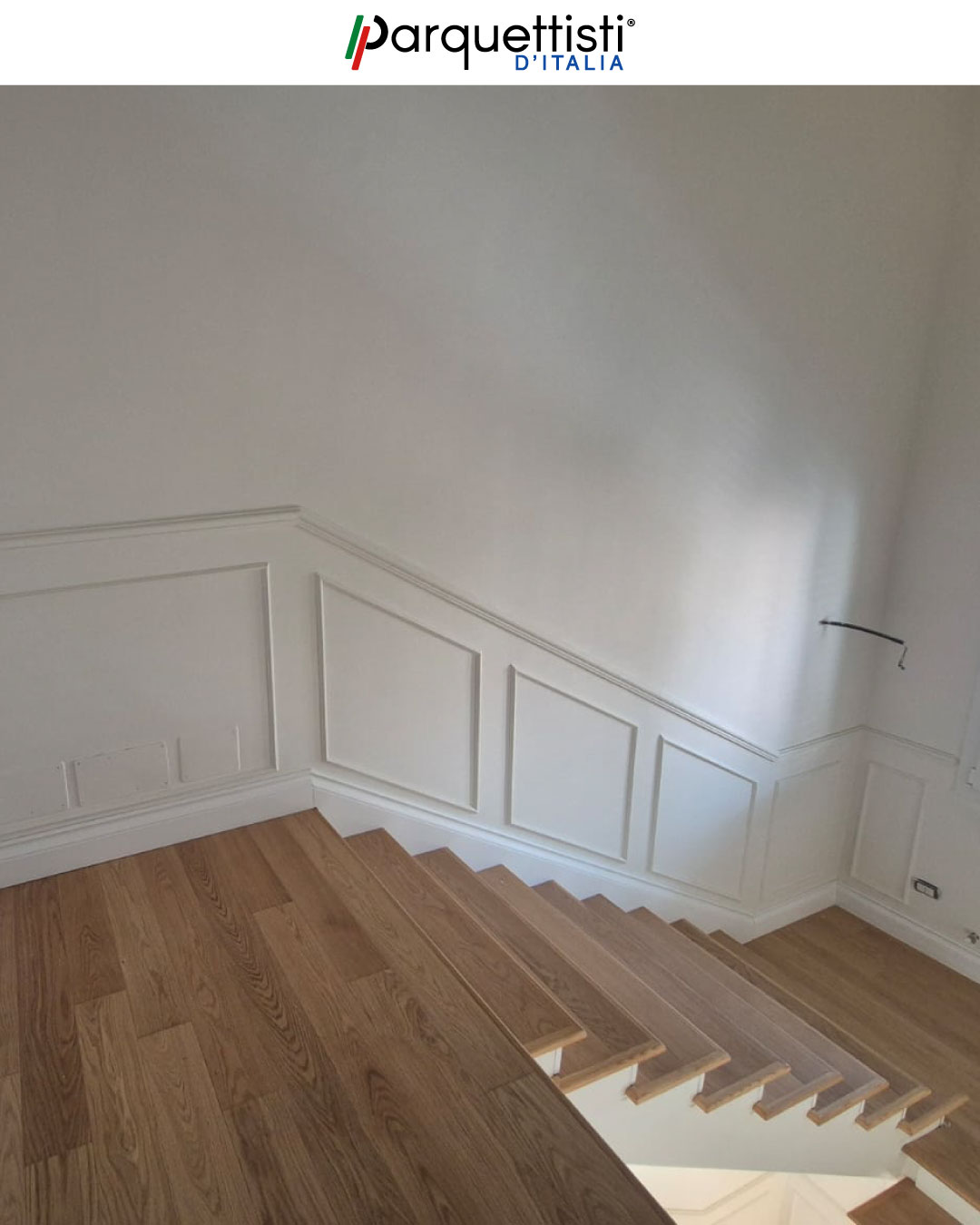 In questo progetto, Maurizio ha impiegato un rovere di prima scelta prefinito con vernice naturale, caratterizzato da una superficie pulita e priva di nodi. La lavorazione esalta la tonalità chiara del legno, utilizzato per uniformare pavimenti e scale. L’integrazione con le ricercate boiserie decorative conferisce agli ambienti un carattere signorile, armonizzando perfettamente artigianato tradizionale e gusto contemporaneo.