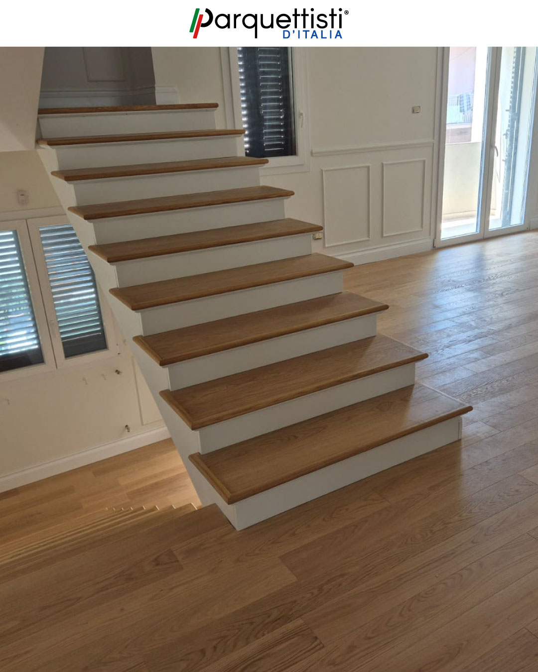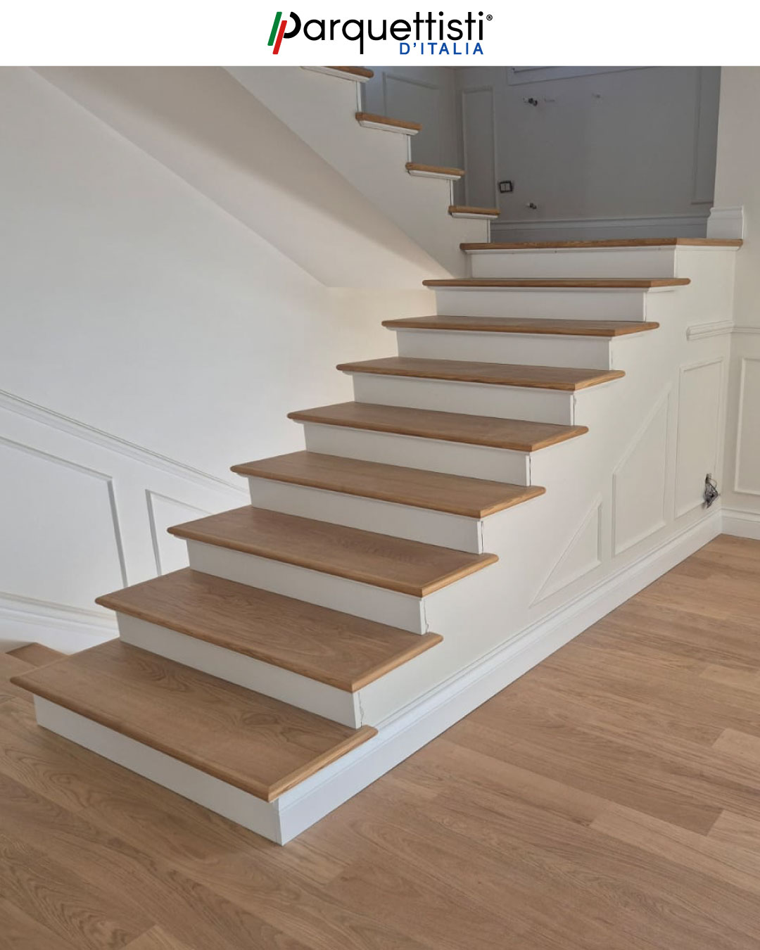 - Posa di Rovere Prima Scelta: Installazione di superfici pulite e prive di nodi con finitura a vernice naturale, utilizzate per uniformare cromaticamente pavimenti e scale.