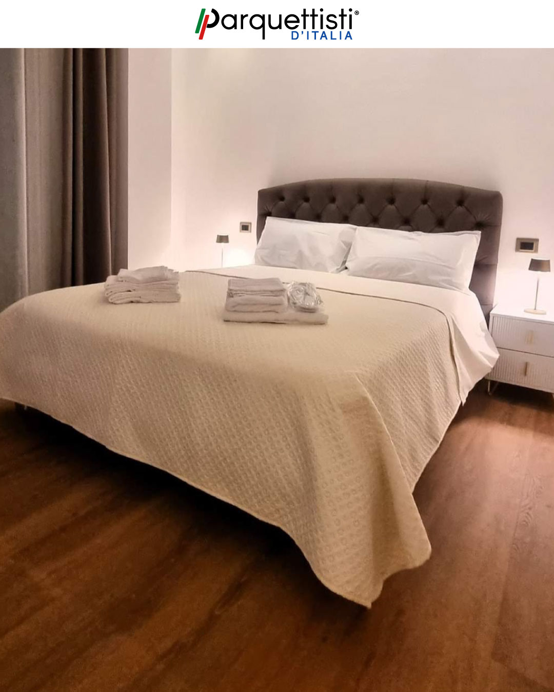 - Posa specialistica in rovere scuro con schema geometrico a spina francese;