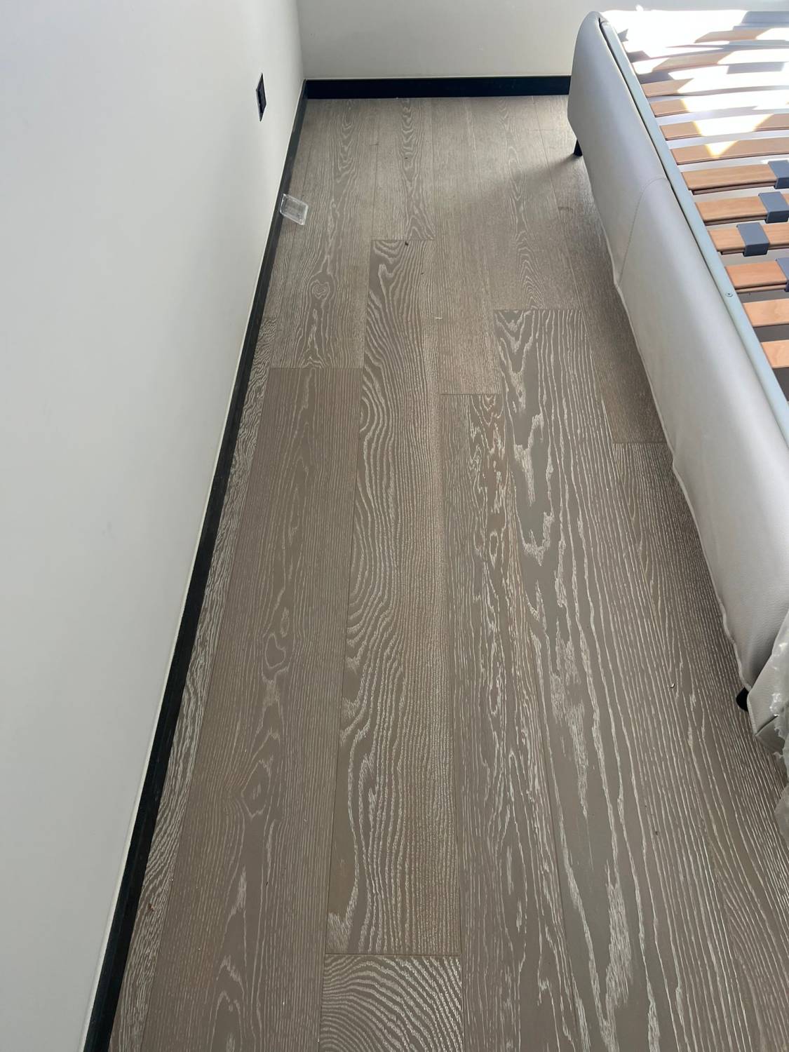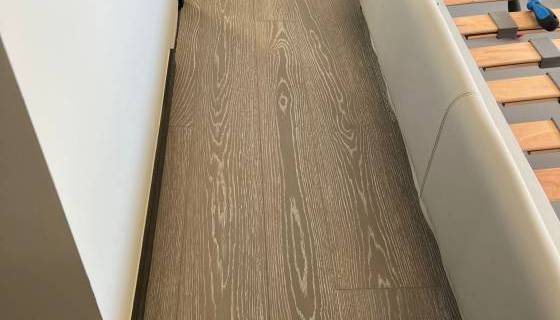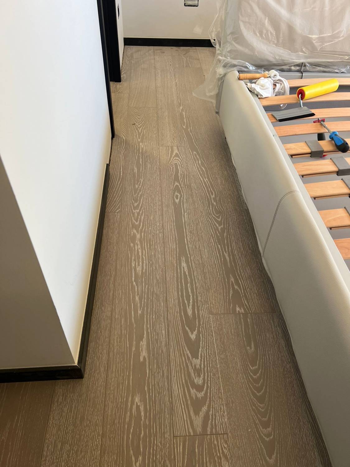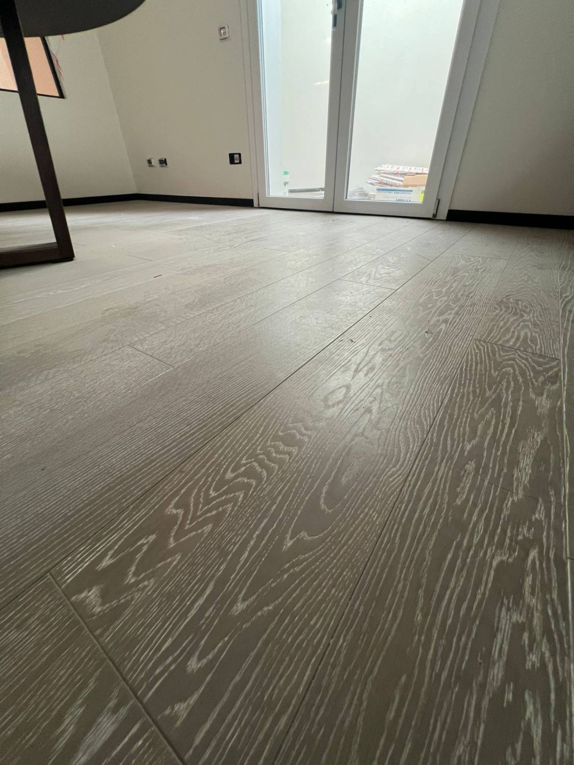 Quello che vedete in questa serie di immagini rappresenta il lavoro di posa in opera di un parquet in legno di rovere con trattamento di spazzolatura profonda per ottenere un effetto noto come decapato. Il decapé in tema di pavimenti in legno identifica un parquet prefinito con un colore, solitamente il bianco, che applicato nella vena delle fiammatura risalta rispetto al colore di fondo del legno che è in contrasto, come in questo caso in color grigio tortora.
