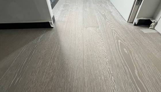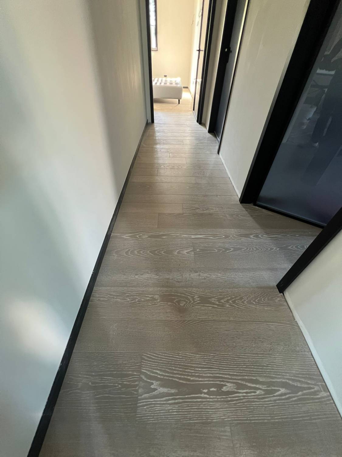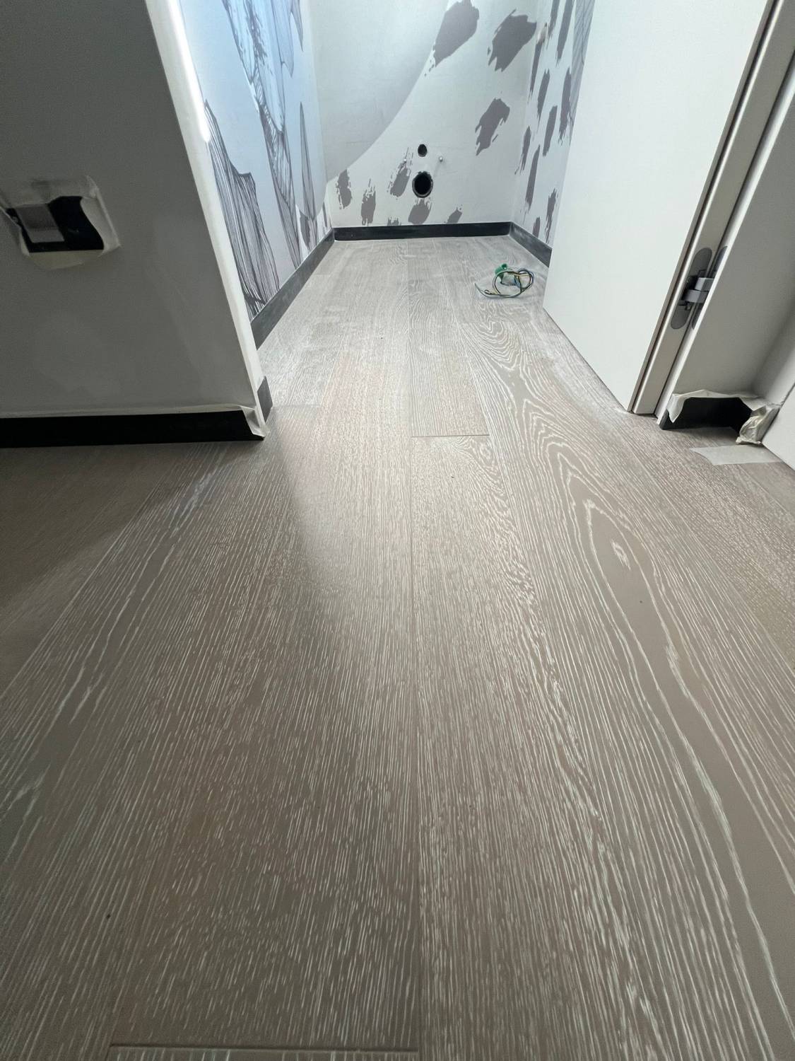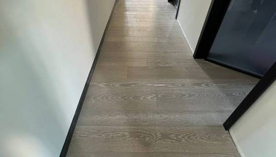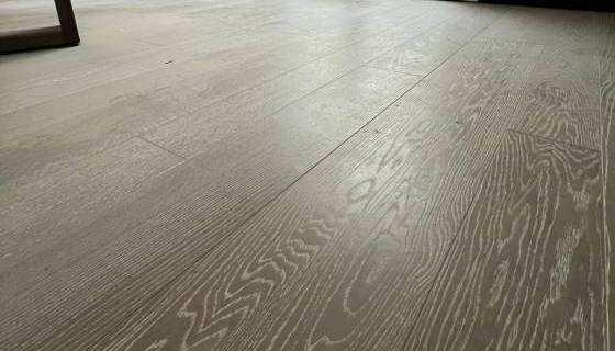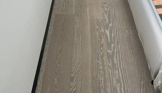 Quello che vedete in questa serie di immagini rappresenta il lavoro di posa in opera di un parquet in legno di rovere con trattamento di spazzolatura profonda per ottenere un effetto noto come decapato. Il decapé in tema di pavimenti in legno identifica un parquet prefinito con un colore, solitamente il bianco, che applicato nella vena delle fiammatura risalta rispetto al colore di fondo del legno che è in contrasto, come in questo caso in color grigio tortora.