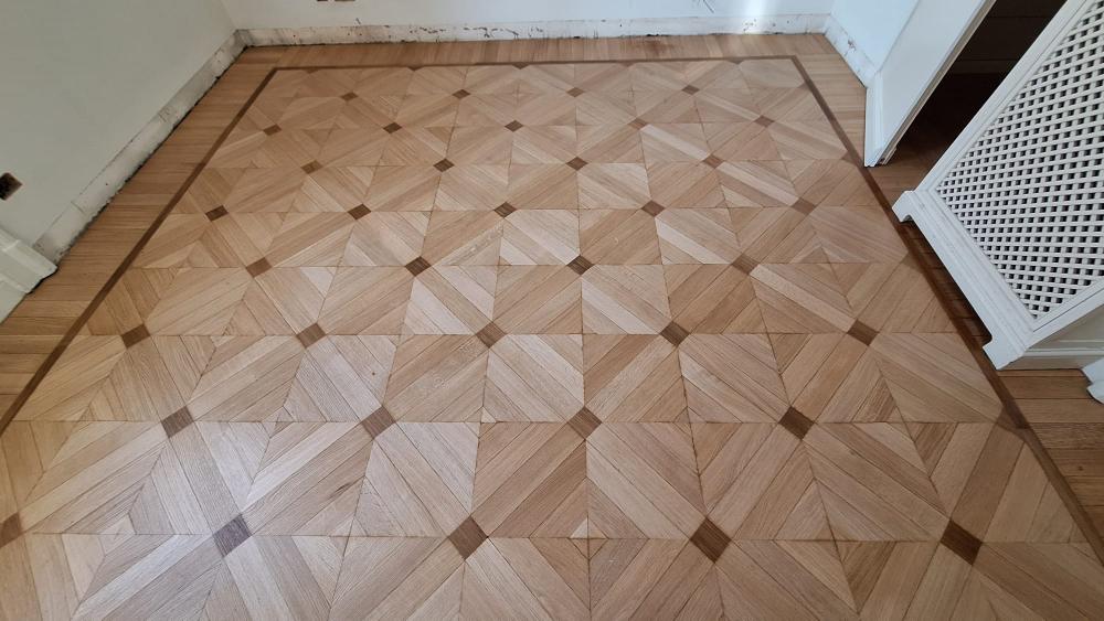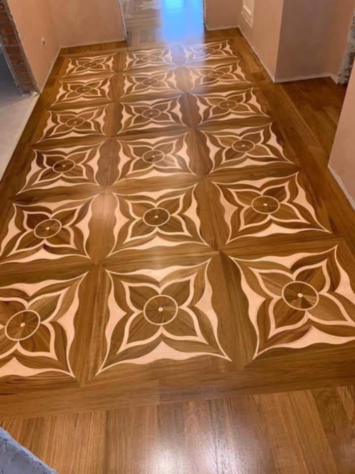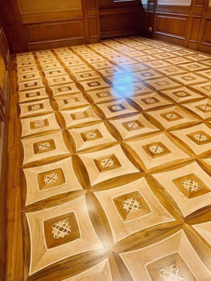 Come non intuire la meravigliosa finitura che questi parquet complessi e di grande impatto estetico e la complessità del lavoro che sta dietro ad un lavoro tanto raffinato: la parte difficile è sicuramente il montaggio di questi parquet tanto sofisticati e complessi da doghe e plance di formati e dimensioni diverse che vanno a formare uno specifico disegno, un arabesco, un vero e proprio mosaico che poi una volta incollato a terra deve essere levigato e riportato in piano perfettamente liscio. Quindi se non si tratta di parquet prefinito, il pavimento in legno va stuccato e di nuovo carteggiato, e questo comporta tempi di meticolosa attesa e attenta procedura, non ci deve essere fretta nè urgenza quando si eseguono certi lavori di precisione, perchè altrimenti si mettono a rischio la perfezione e la miglior riuscita delle fasi successive di verniciatura del parquet e la relativa finitura liscia e priva di imperfezioni. Si deve fare attenzione a lavorare sempre in assenza di polvere e con calzari specifici per evitare di lasciare impronte sotto la vernice.
