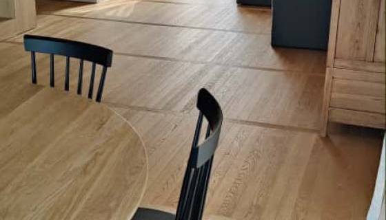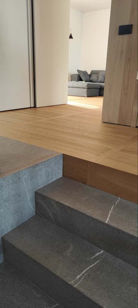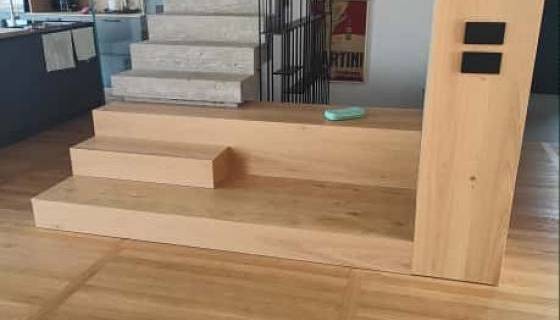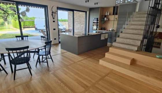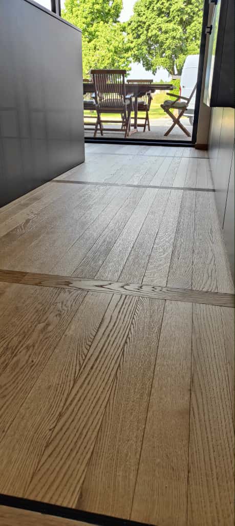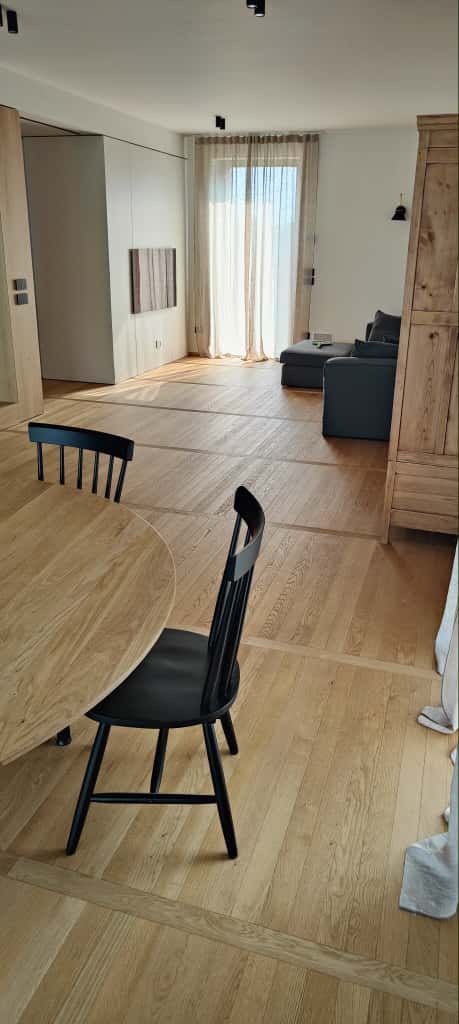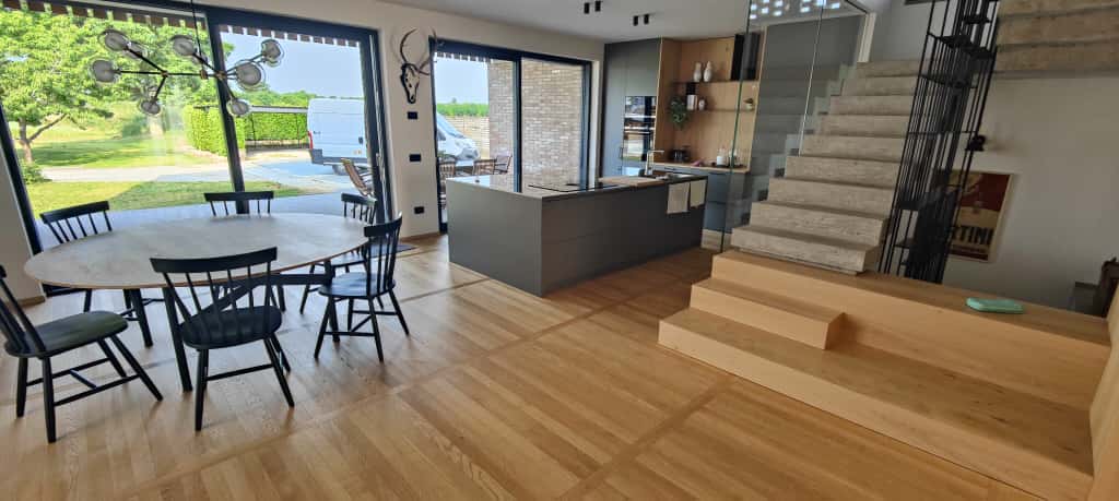 Ferruccio è un Signore del Parquet: come poterlo definire diversamente dopo tanti anni spesi a lavorare con attenzione e qualità nel mondo della posa e levigatura dei pavimenti in legno. Non solo: Ferruccio è uno specialista a 360 gradi che si occupa anche di laminature e ripristini di pavimenti in legno rovinati, ma anche di montaggio e posa di succedanei del legno quali i laminati e parquet in PVC e PSC ad effetto legno. In questo caso condivide con noi fotografie di un lavoro molto complesso, risultato di una posa certosina di plancette di parquet prefinito in legno di rovere con finitura opaca naturale color miele, con disegno a binario, o posa parallela, interrotte da file ortogonali di medesimo legno disposte ad attraversare lo schema principale.