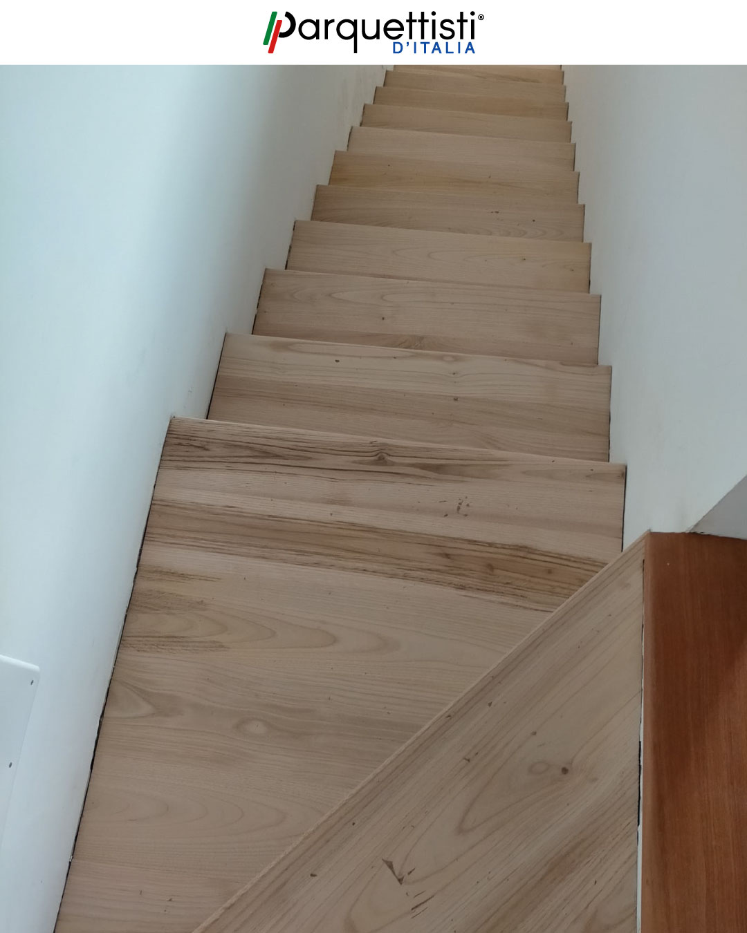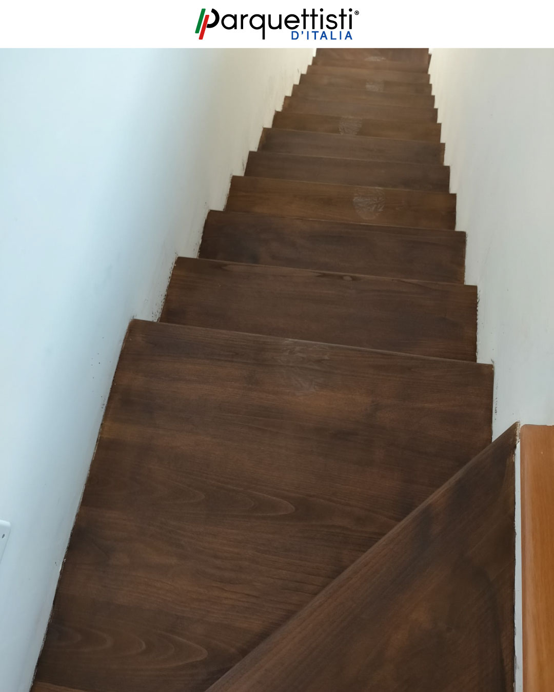 Levigatura scala in legno e tintura noce scuro con vernice