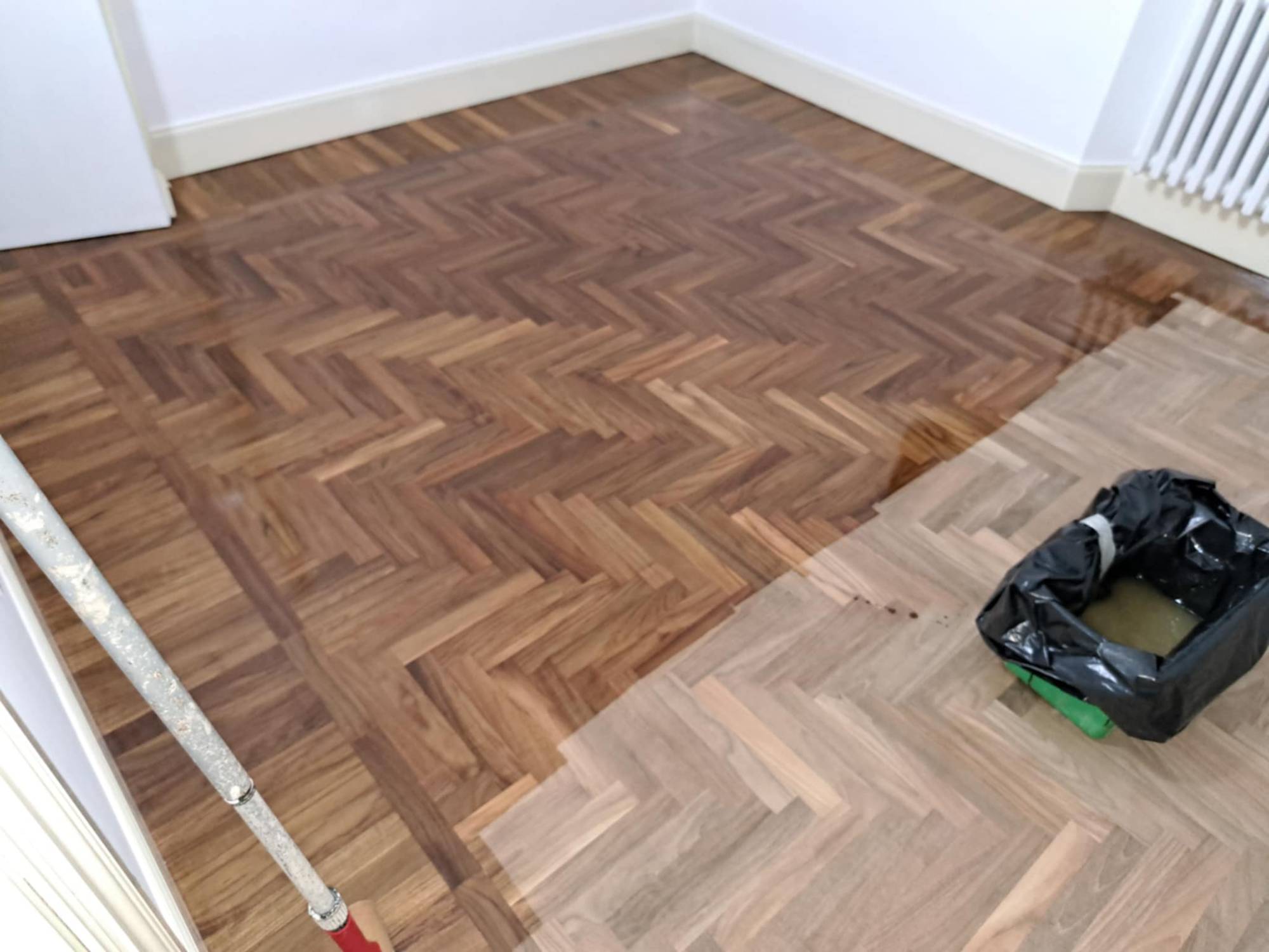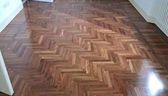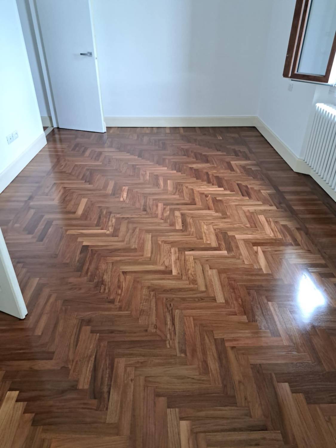 Le immagini che ci ha mandato Andrea, parquettista toscano iscritto al portale, rappresentano un lavoro di recupero piuttosto complicato data la natura di questo pavimento in legno di teak posato a spina italiana. Infatti alcune essenze di legno da parquet sono più ostiche di altre a levigare e riportare al grezzo prima di farne i dovuti trattamenti di ripristino, quali la stuccatura e la verniciatura. Infatti il legno di teak di questo parquet per essere riportato al legno vivo necessita molti passaggi a macchina per asportare prima la vecchia vernice poi riportare la superficie a "poro aperto" come si dice nell'ambiente. Solo così si potrà poi intervenire con il recupero delle parti distaccate, fessurate e riempirle di stucco, per poi ricarteggiare il parquet e prepararlo alla verniciatura finale (eseguita ovviamente a più mani successive e carteggiando anche tra la prima di fondo e la seconda di finitura). Il motivo per cui il teak presenta difficiltà rspetto ad una pianta di conifera ad esempio, come il parquet in rovere assai più noto, è che il teak essendo una essenza oleosa impasta i dischi abrasivi della macchina rendenone necessaria una ripetata sostituzione. Se si pensa che per una perfetta lamatura bisogna alternare in sequenza fino a 5/6 grane decrescenti di durezza, si fa presto il conto di quanto tempo e denaro costi questo specifico tipo di lavorazione.