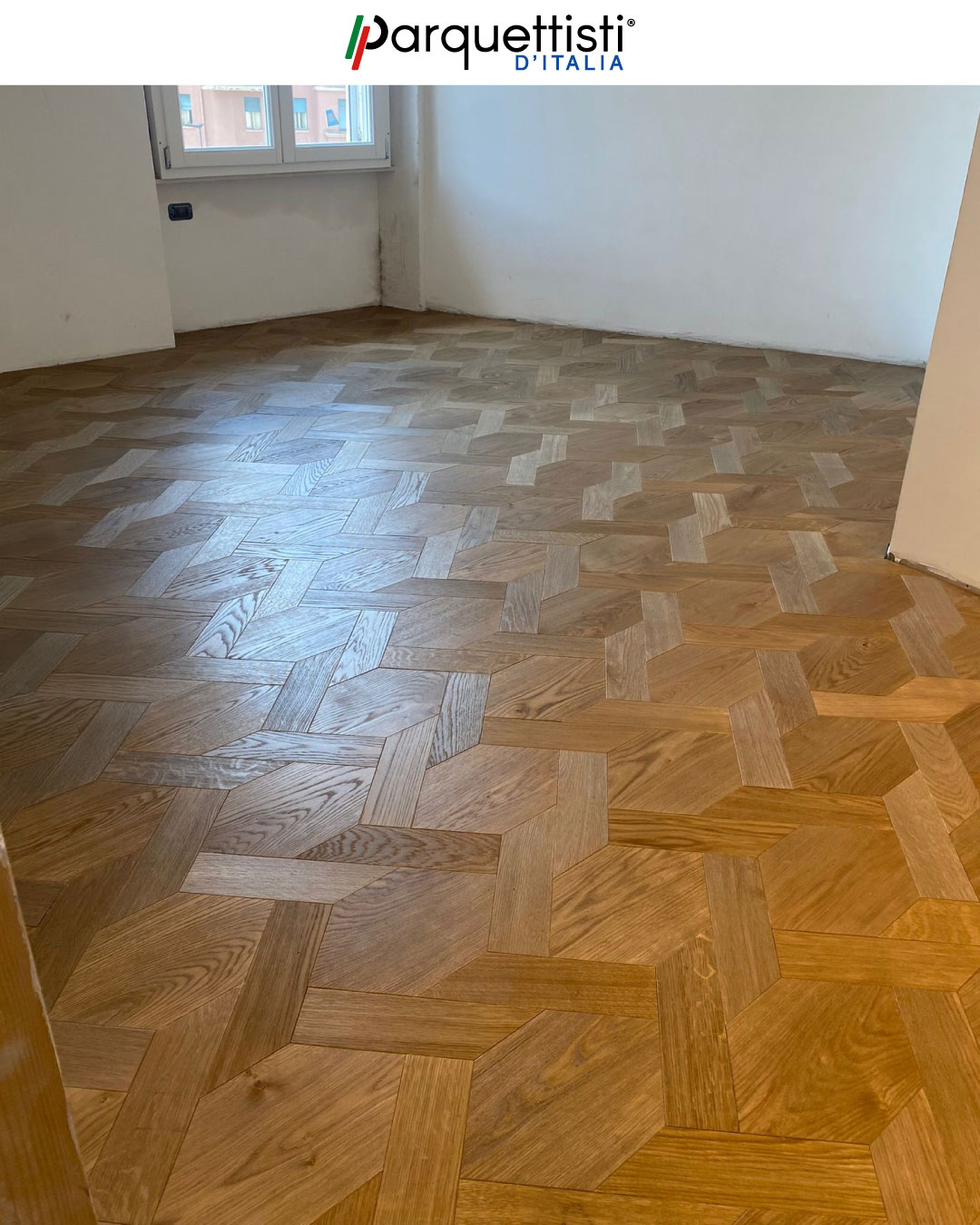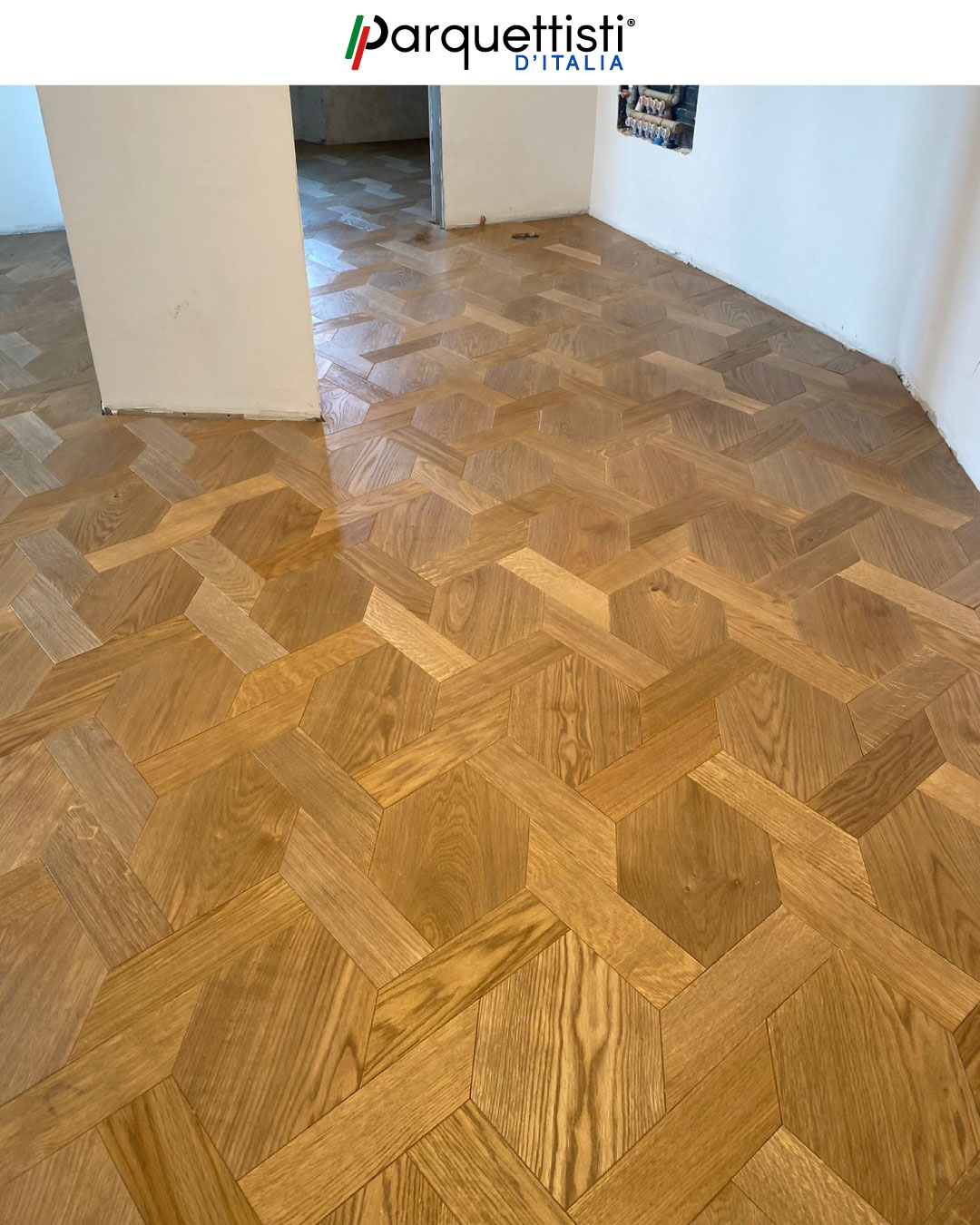 - Installazione di moduli esagonali in rovere con cornice decorativa perimetrale a contrasto;