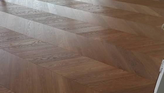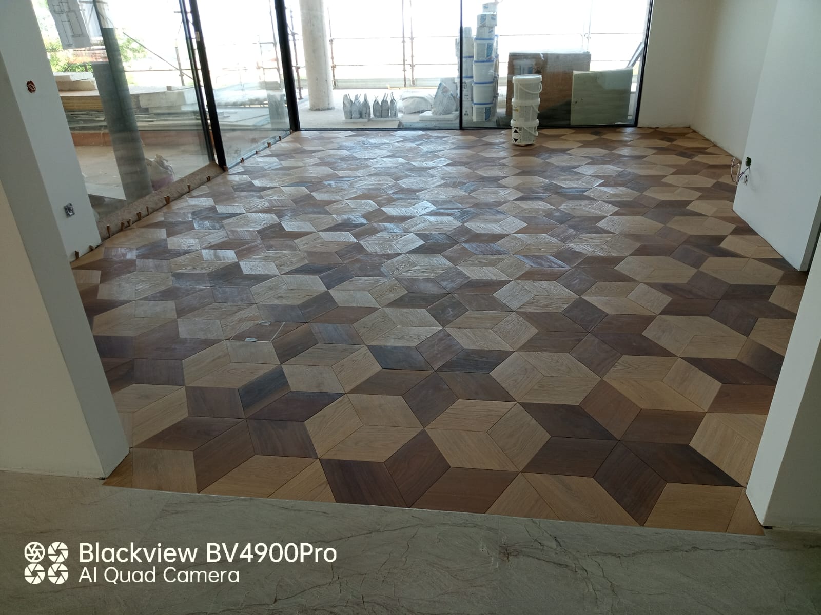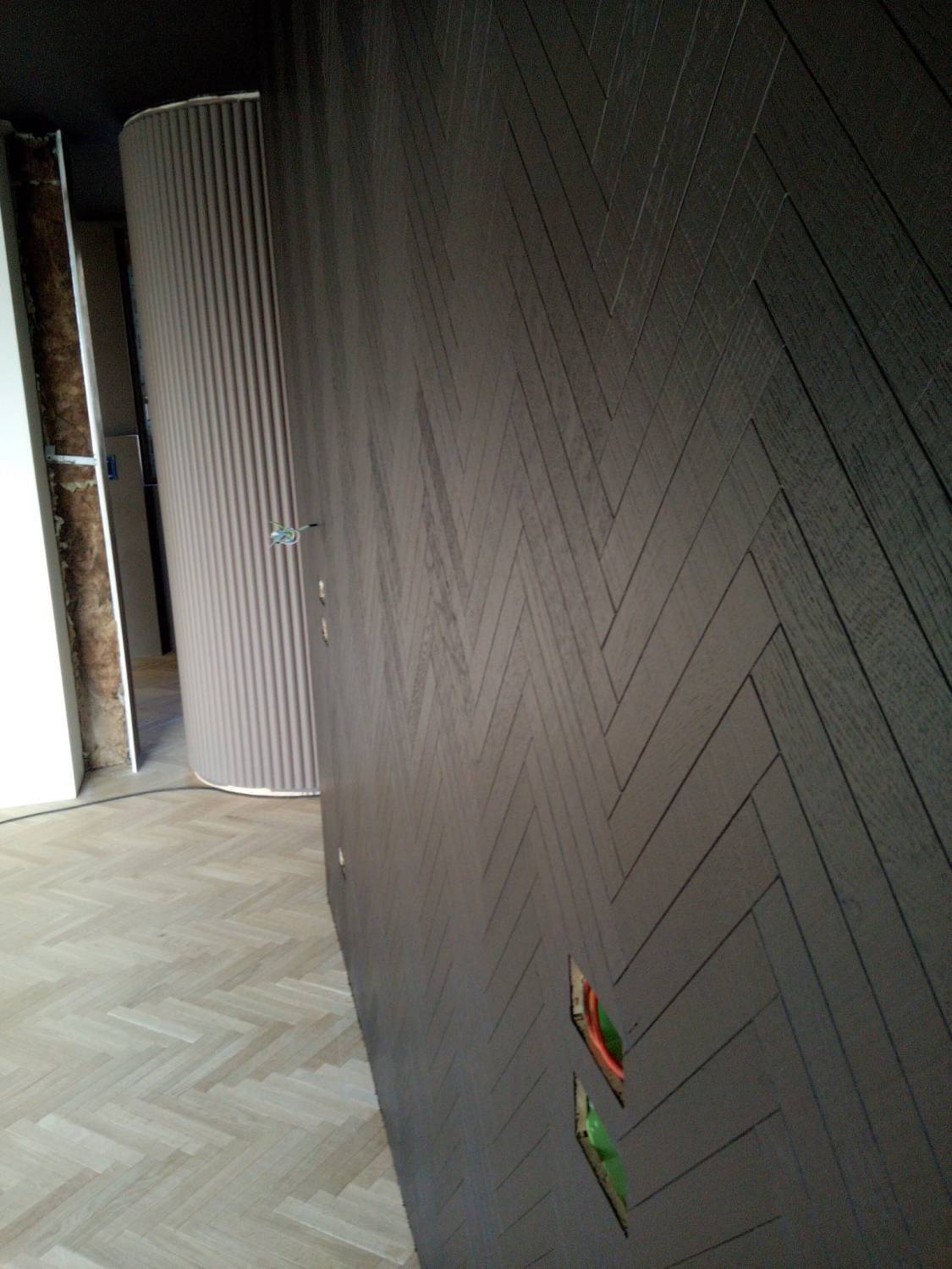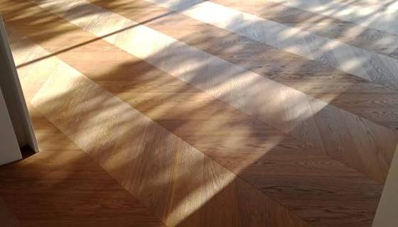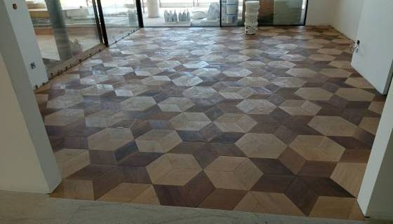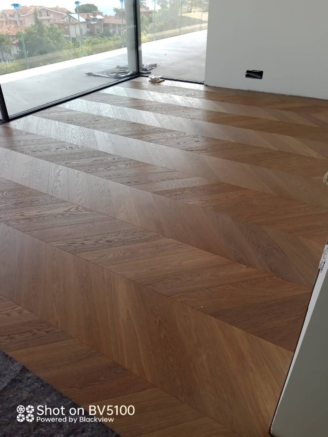 Come si può qualificare un artigiano del parquet attraverso i propri lavori? Queste immagini parlano chiaro: Massimiliano è un artigiano che opera nel mondo dei parquet e dei pavimenti in legno, ma anche nel montaggio di rivestimenti in legno da parete, che con l'apporto di queste fotografie ci comunica tutta l'abilità necessaria nelle finiture di certe pose speciali. In particolare invitiamo a soffermarvi sulla precisione di tagli e incollaggi su misura di parquet prefinito in rovere intorno alle placchette delle prese di corrente e degli interruttori della luce, senza perdere la continuità della posa di pavimento e pareti in legno, ma anche la perfetta compattezza e accoppiamento della doghe in formato spina francese a 45° in rovere. Cosa dire poi del parquet a mosaico in vero legno posato con tecnica incollata con tanti rombi in rovere che compongono esagoni regolari? Una meraviglia.