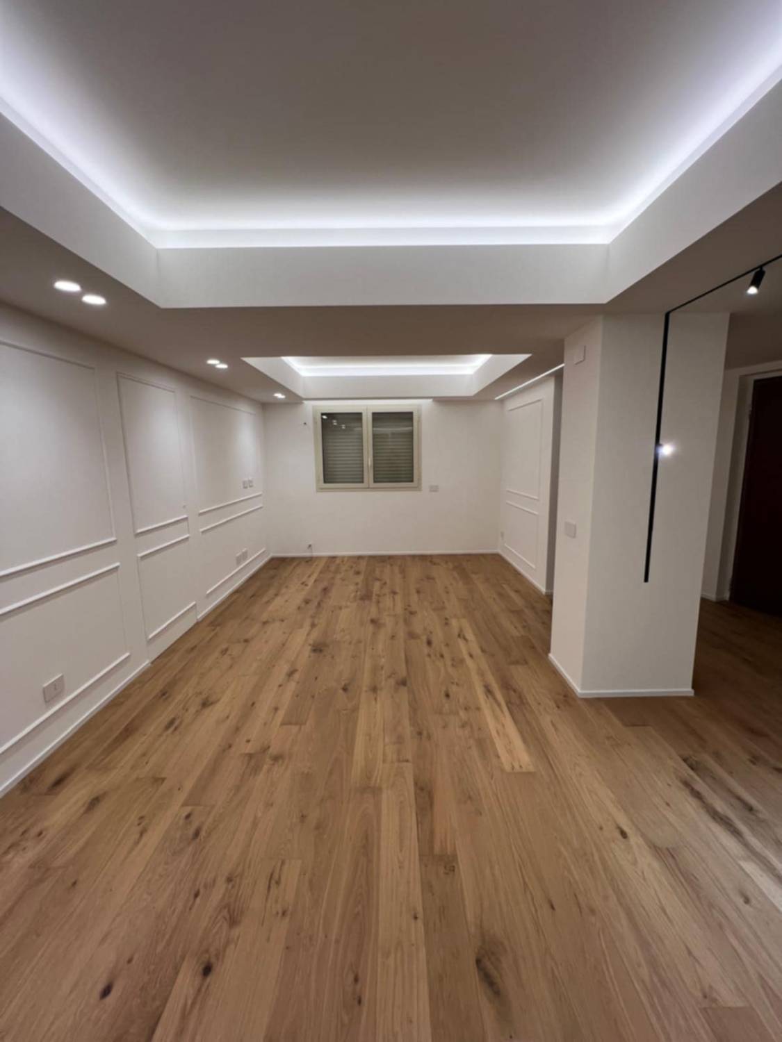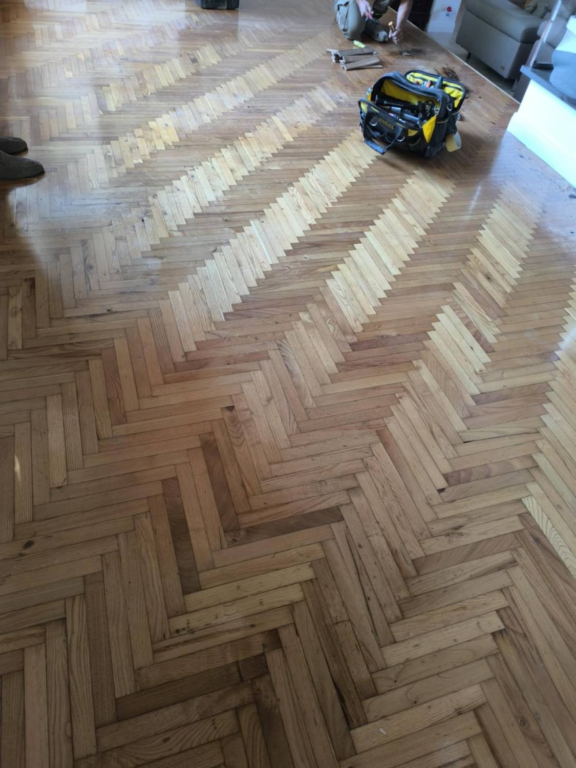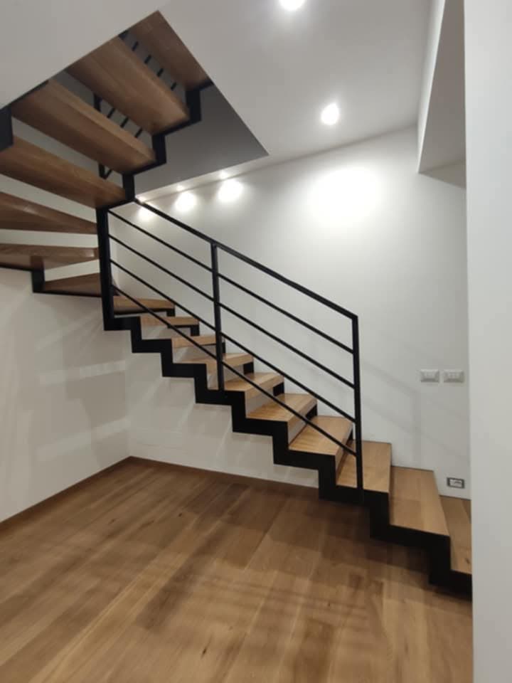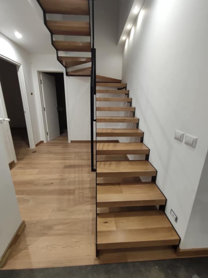 Ma torniamo ai lavori che ha condiviso gentilmente con noi Gianluca: si tratta di vari ambienti con tipi di legno e sistemi di montaggio di parquet differenti, si va dalla spina italiana in rovere alle doghe di quercia rustica posate a correre. Anche le scale e relative coperture in legno dei gradini sono stati realizzati con manualità tutta artigianale e su misura sempre partendo dal medesimo legno utilizzato per il parquet. I listincini in legno massello disposti a quadrotte contrapposte si chiamainvece parquet industriale, molto in voga negli anni 70 e 80 e tornato oggi in auge in formati più grandi ma con medesimo senso e sistema di posa. Gianluca ha montato alcuni di questi pavimenti allo stato grezzo per poi levigarli e stuccarli e verniciarli a terra, mentre altri erano prefiniti già verniciati e pronti al montaggio con sistema incollato o con posa flottante usando appositi tappetini fonoassorbenti. In ogni caso le foto raccontano di una paziente dedizione al cliente e noi siamo fieri di condividerne le foto sul portale dei Parquettisti Italiani.
