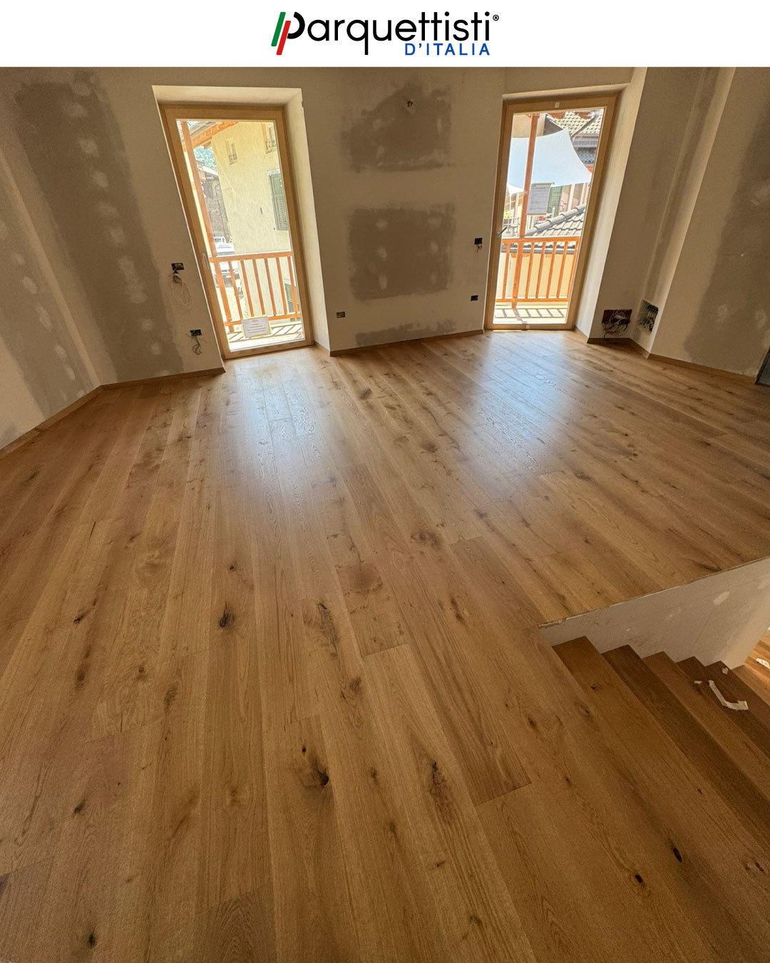 - Installazione di parquet in rovere nodato prefinito in doghe di grande formato con finitura naturale;